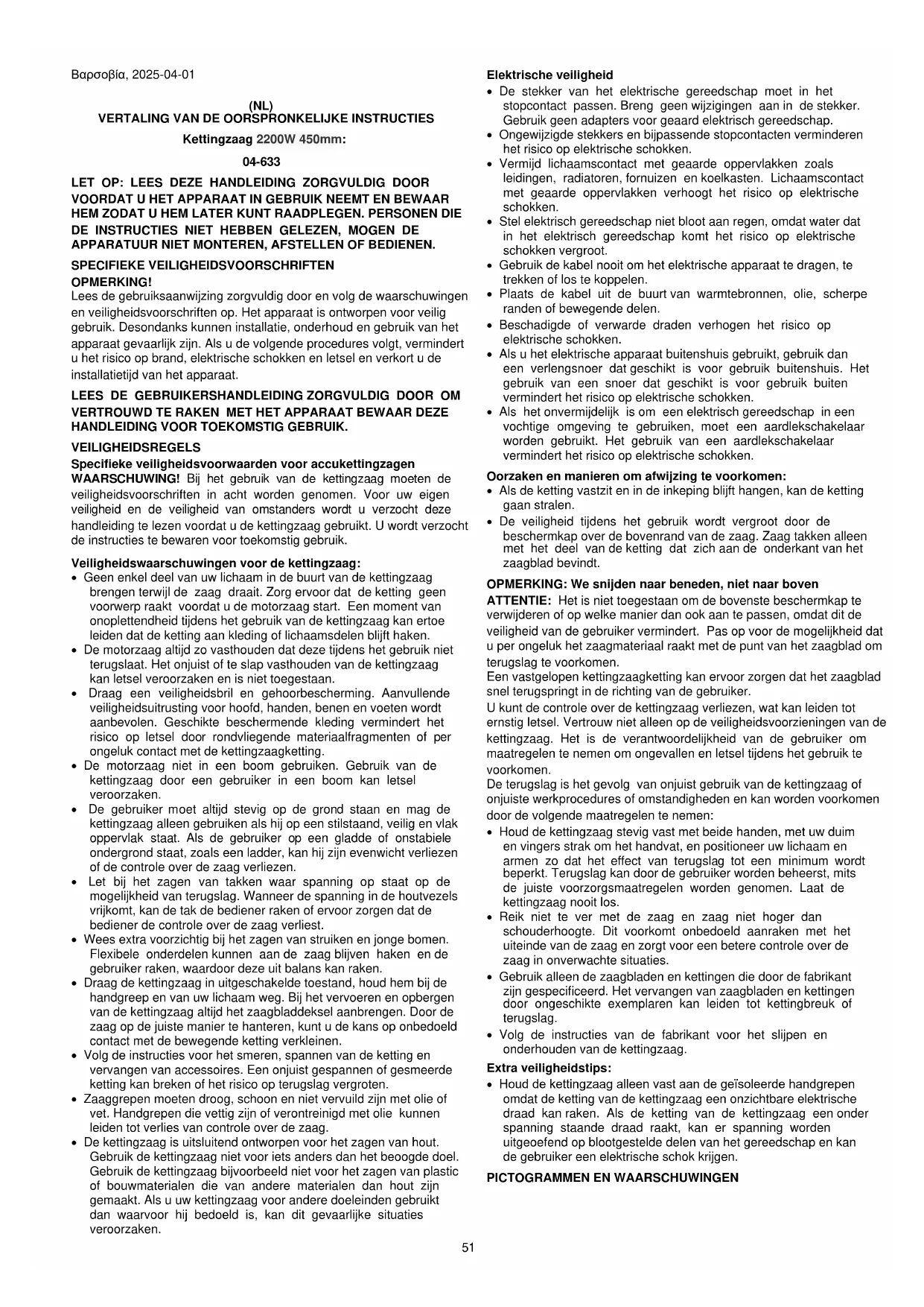 Kettingzaag 2200W 450mm: 04-633 LET OP: LEES DEZE HANDLEIDING ZORGVULDIG DOOR VOORDAT U HET APPARAAT IN GEBRUIK NEEMT EN BEWAAR HEM ZODAT U HEM LATER KUNT RAADPLEGEN. PERSONEN DIE DE INSTRUCTIES NIET HEBBEN GELEZEN, MOGEN DE APPARATUUR NIET MONTEREN, AFSTELLEN OF BEDIENEN. SPECIFIEKE VEILIGHEIDSVOORSCHRIFTEN OPMERKING! Lees de gebruiksaanwijzing zorgvuldig door en volg de waarschuwingen en veiligheidsvoorschriften op. Het apparaat is ontworpen voor veilig gebruik. Desondanks kunnen installatie, onderhoud en gebruik van het apparaat gevaarlijk zijn. Als u de volgende procedures volgt, vermindert u het risico op brand, elektrische schokken en letsel en verkort u de installatietijd van het apparaat.