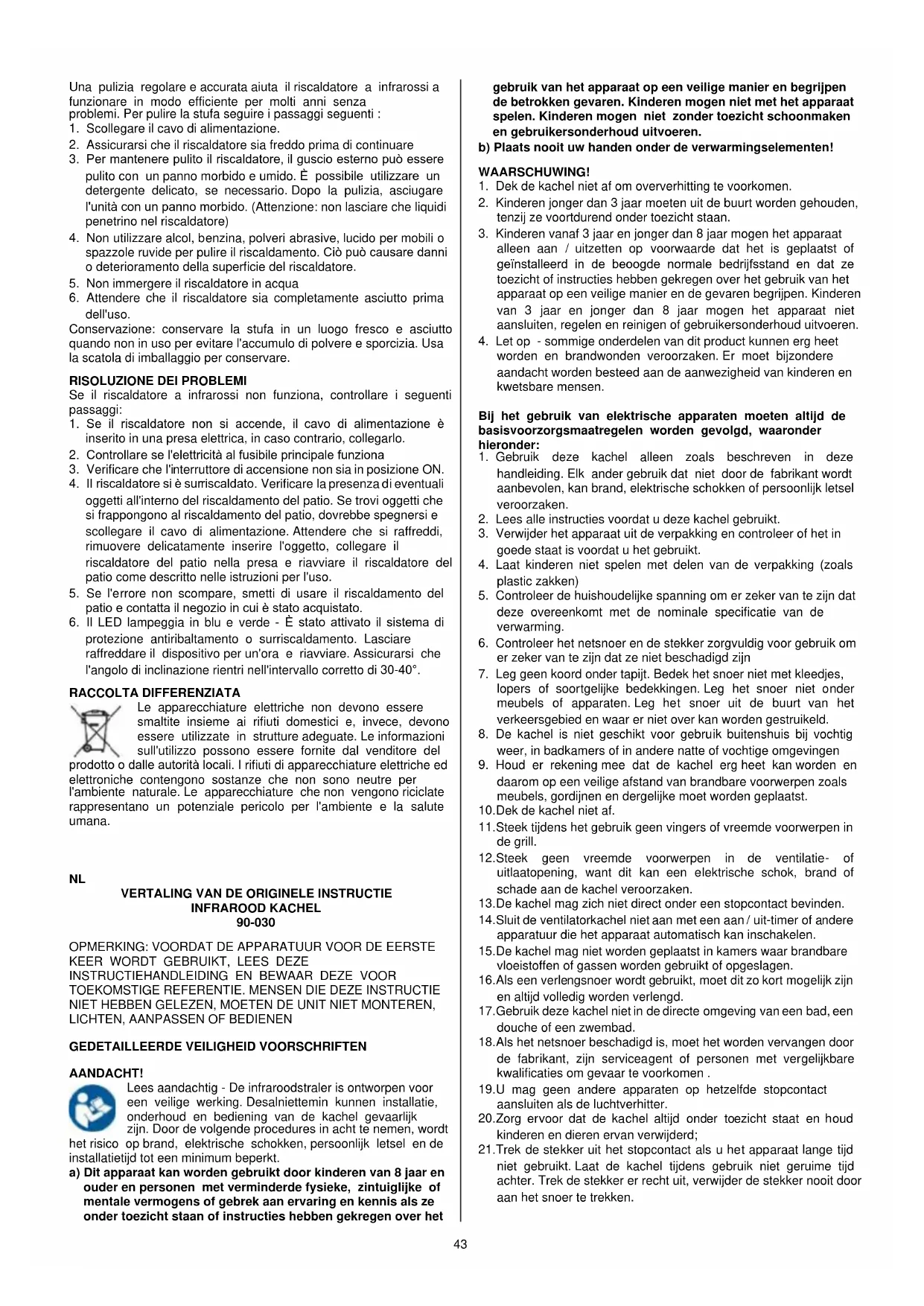 oververhittingsbeveiliging is geactiveerd. Laat het apparaat een uur afkoelen en start het opnieuw. Zorg ervoor dat de kantelhoek binnen het juiste bereik van 30-40 ° valt. RECYCLING Elektrische apparatuur mag niet worden weggegooid als huishoudelijk afval en moet in plaats daarvan worden gebruikt in geschikte voorzieningen. Informatie over het gebruik kan worden verstrekt door de productverkoper of de lokale autoriteiten. Afgedankte elektrische en elektronische apparatuur bevat stoffen die niet neutraal zijn voor de natuurlijke omgeving. Apparatuur die niet wordt gerecycled vormt een potentieel gevaar voor het milieu en de menselijke gezondheid.