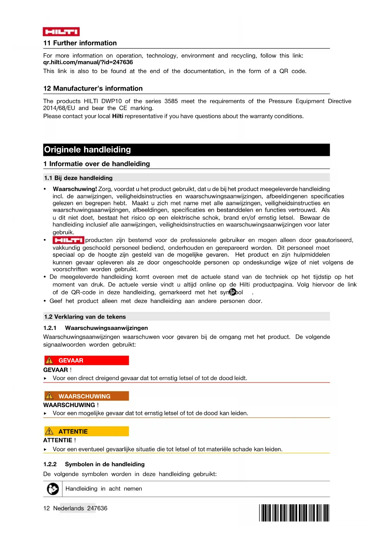 Veiligheidsklep is defect ▶ Laat het apparaat door de Hilti Service repareren. Manometer geeft geen druk in het reservoir aan Manometer is defect ▶ Laat het apparaat door de Hilti Service repareren. 9 Recycling Geef dit product niet met het huisvuil mee! Hilti apparaten zijn voor een groot deel vervaardigd uit materialen die kunnen worden gerecycled. Voor recycling is een juiste materiaalscheiding noodzakelijk. In een groot aantal landen neemt Hilti uw oude apparaat voor recycling terug. Vraag hiernaar bij de klantenservice van Hilti of bij uw verkoopadviseur. 10 Fabrieksgarantie ▶ Neem bij vragen over de garantievoorwaarden contact op met uw lokale Hilti-dealer. 11 Meer informatie Meer informatie over bediening, technologie, milieu en recycling vindt u onder de volgende link: qr.hilti.com/manual/?id=247636 Deze link vindt u ook aan het einde van de documentatie als QR-code. 12 Informatie fabrikant De HILTI DWP10-producten uit de 3585-serie voldoen aan de eisen van de Richtlijn Drukapparatuur 2014/68/EU en dragen de CE-markering. Neem bij vragen over de garantievoorwaarden contact op met uw lokale Hilti-dealer.18 Français 247636 *247636* Notice d'utilisation originale 1 Indications relatives au mode d'emploi