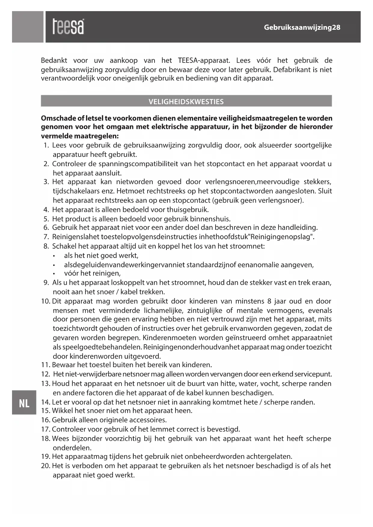 Bedankt voor uw aankoop van het TEESA-apparaat. Lees voor het gebruik de gebruiksaanwijzing zorgvuldig door en bewaar deze voor later gebruik. Defabrikant is Niet verantwoordelijk voor oneigenlijk gebruik en bediening van dit apparaat.