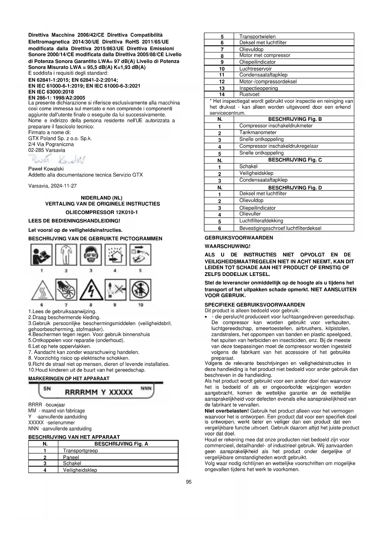 Elektrisch aangedreven producten mogen niet met het huishoudelijk afval worden weggegooid, maar moeten naar een geschikte afvalverwerkingsfaciliteit worden gebracht. Neem contact op met de leverancier van uw product of de plaatselijke autoriteiten voor informatie over afvalverwijdering. Afgedankte elektrische en elektronische apparatuur bevat stoffen die niet milieuvriendelijk zijn. Niet-gerecyclede apparatuur vormt een potentieel risico voor het milieu en de menselijke gezondheid. "GTX Polen Spółka z ograniczoną odpowiedzialnością". Spółka komandytowa met maatschappelijke zetel in Warschau, ul. Pograniczna 2/4 (hierna: "GTX Polen") informeert dat alle auteursrechten op de inhoud van deze handleiding (hierna: "handleiding"), met inbegrip van onder andere. Alle auteursrechten op de inhoud van deze handleiding (hierna te noemen "handleiding"), met inbegrip van maar niet beperkt tot de tekst, foto's, diagrammen, tekeningen, evenals de samenstelling ervan, behoren uitsluitend tot GTX Polen en zijn onderworpen aan de wettelijke bescherming op grond van de wet van 4 februari 1994 inzake het auteursrecht en de naburige rechten (d.w.z. Journal of Laws 2006 nr. 90 Item 631, zoals gewijzigd). Het kopiëren, verwerken, publiceren, wijzigen voor commerciële doeleinden van de gehele handleiding en de afzonderlijke elementen zonder schriftelijke toestemming van GTX Polen is ten strengste verboden en kan leiden tot civiele en strafrechtelijke aansprakelijkheid. EG-verklaring van overeenstemming Fabrikant: GTX Polen Sp. z o.o. Sp.k, 2/4 Pograniczna-straat 02-285 Warschau Product: Compressor Model: 12K010-1 Handelsnaam: NEO TOOLS Serienummer: 00001 ÷ 99999 Het hierboven beschreven product voldoet aan de volgende documenten: Machinerichtlijn 2006/42/EG Richtlijn elektromagnetische compatibiliteit 2014/30/EU RoHS-richtlijn 2011/65/EU zoals gewijzigd door Richtlijn 2015/863/EU Richtlijn geluidsemissie 2000/14/EG zoals gewijzigd door 2005/88/EG Gegarandeerd geluidsvermogensniveau LWA = 97 dB(A) Gemeten geluidsvermogensniveau LWA = 95,5 dB(A) K=1,93 dB(A) En voldoet aan de eisen van de normen: EN 62841-1:2015; EN 62841-2-2:2014; EN IEC 61000-6-1:2019; EN IEC 61000-6-3:2021 EN IEC 63000:2018 EN 286-1: 1998/A2:2005 Deze verklaring heeft alleen betrekking op de machine zoals die in de handel wordt gebracht en niet op componenten toegevoegd door de eindgebruiker of later door hem/haar uitgevoerd. Naam en adres van de in de EU woonachtige persoon die gemachtigd is om het technisch dossier voor te bereiden: Ondertekend namens: GTX Polen Sp. z o.o. Sp.k. 2/4 Pograniczna-straat 02-285 Warschau Paweł Kowalski Medewerker technische documentatie GTX Service Warschau, 2024-11-27 PORTUGAL (PT)
