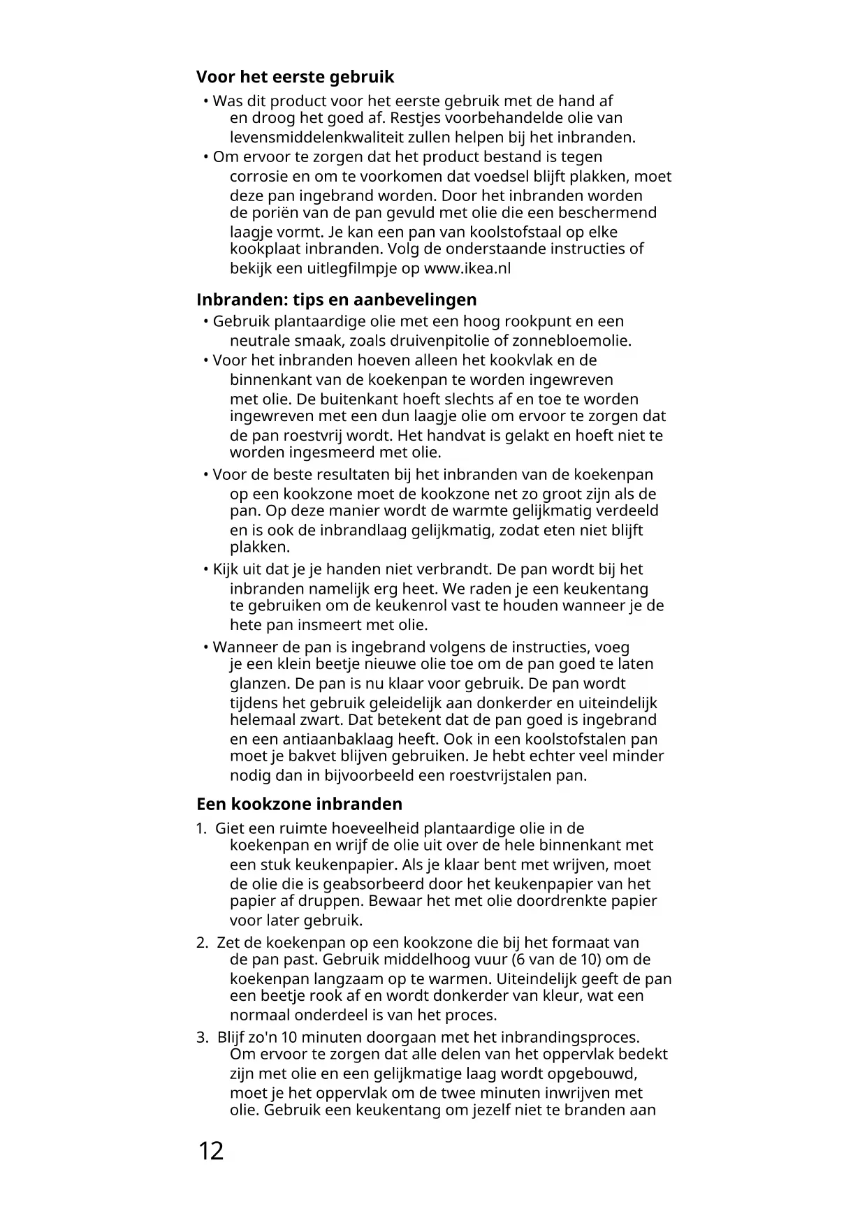 - Om ervoor te zorgen dat het product bestand is tegen corrosie en om te voorkomen dat voedsel blijft plakken, moet deze pan ingebrand worden. Door het inbranden worden de poriën van de pan gevuld met olie die een beschermend laagje vormt. Je kan een pan van koolstofstaal op elke kookplaat inbranden. Volg de onderstaande instructies of bekijk een uitleglmpje op www.ikea.nl Inbranden: tips en aanbevelingen