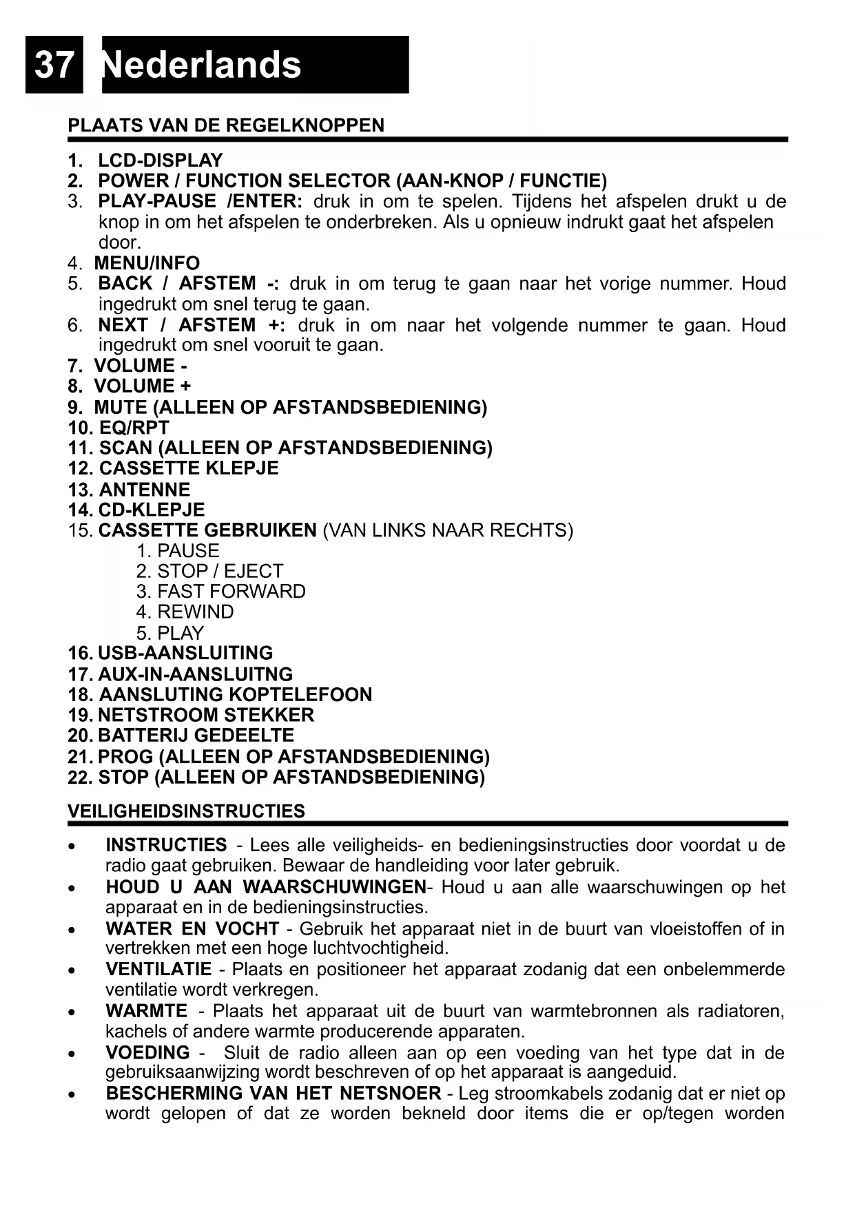 - INSTRUCTIES - Lees alle veiligheids- en bedieningsinstructies door voordat u de radio gaat gebruiken. Bewaar de handleiding voor later gebruik.
