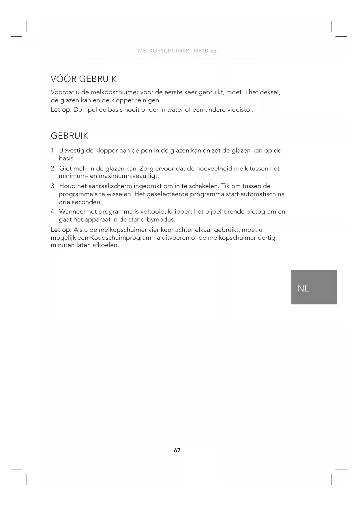 Voordat u de melkopschuimer voor de eerste keer gebruikt, moet u het deksel, de glazen kan en de klopper reinigen. Let op: Dompel de basis nooit onder in water of een andere vloeistof. GEBRUIK
