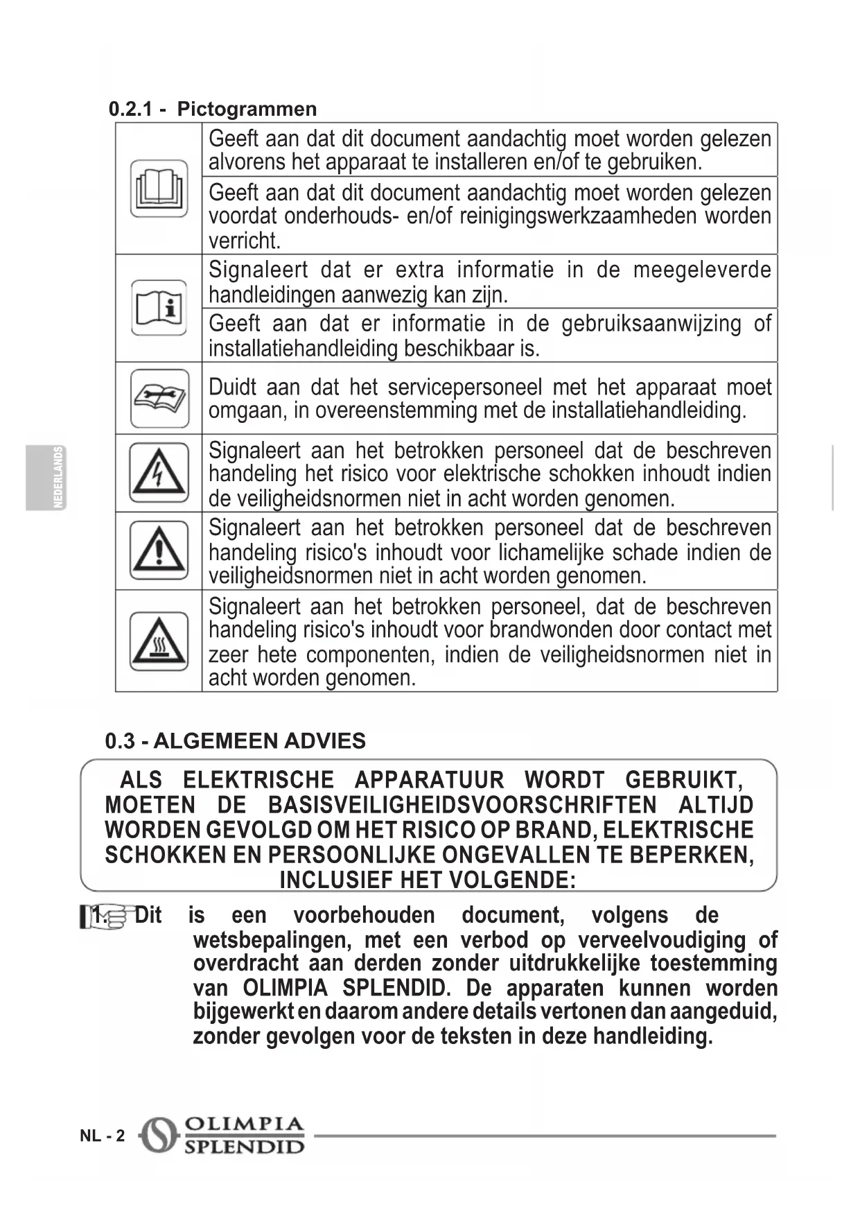 wetsbepalingen, met een verbod op verveelvoudiging of overdracht aan derden zonder uitdrukkelijke toestemming van OLIMPIA SPLENDID. De apparaten kunnen worden bijgewerkt en daarom andere details vertonen dan aangeduid, zonder gevolgen voor de teksten in deze handleiding. ALS ELEKTRISCHE APPARATUUR WORDT GEBRUIKT,