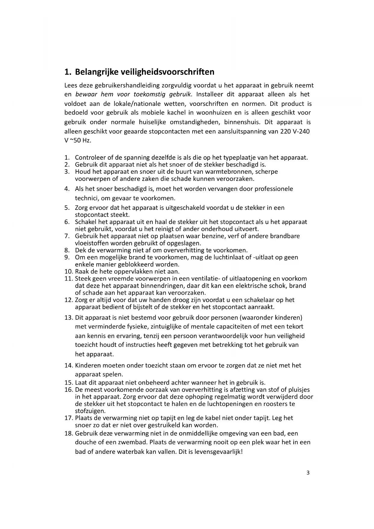 Lees deze gebruikershandleiding zorgvuldig voordat u het apparaat in gebruik neemt en bewaar hem voor toekomstig gebruik. Installeer dit apparaat alleen als het voldoet aan de lokale/nationale wetten, voorschriften en normen. Dit product is bedoeld voor gebruik als mobiele kachel in woonhuizen en is alleen geschikt voor gebruik onder normale huiselijke omstandigheden, binnenshuis. Dit apparaat is alleen geschikt voor geaarde stopcontacten met een aansluitspanning van 220 V-240 V ~50 Hz.