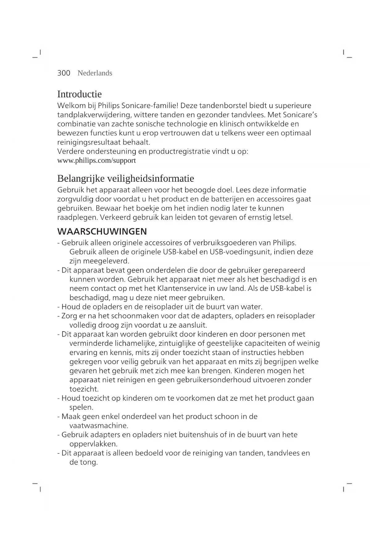Nederlands Introductie Welkom bij Philips Sonicare-familie! Deze tandenborstel biedt u superieure tandplakverwijdering, wittere tanden en gezonder tandvlees. Met Sonicare’s combinatie van zachte sonische technologie en klinisch ontwikkelde en bewezen functies kunt u erop vertrouwen dat u telkens weer een optimaal reinigingsresultaat behaalt. Verdere ondersteuning en productregistratie vindt u op: www.philips.com/support Belangrijke veiligheidsinformatie Gebruik het apparaat alleen voor het beoogde doel. Lees deze informatie zorgvuldig door voordat u het product en de batterijen en accessoires gaat gebruiken. Bewaar het boekje om het indien nodig later te kunnen raadplegen. Verkeerd gebruik kan leiden tot gevaren of ernstig letsel. WAARSCHUWINGEN - Gebruik alleen originele accessoires of verbruiksgoederen van Philips. Gebruik alleen de originele USB-kabel en USB-voedingsunit, indien deze zijn meegeleverd. - Dit apparaat bevat geen onderdelen die door de gebruiker gerepareerd kunnen worden. Gebruik het apparaat niet meer als het beschadigd is en neem contact op met het Klantenservice in uw land. Als de USB-kabel is beschadigd, mag u deze niet meer gebruiken. - Houd de opladers en de reisoplader uit de buurt van water. - Zorg er na het schoonmaken voor dat de adapters, opladers en reisoplader volledig droog zijn voordat u ze aansluit. - Dit apparaat kan worden gebruikt door kinderen en door personen met verminderde lichamelijke, zintuiglijke of geestelijke capaciteiten of weinig ervaring en kennis, mits zij onder toezicht staan of instructies hebben gekregen voor veilig gebruik van het apparaat en mits zij begrijpen welke gevaren het gebruik met zich mee kan brengen. Kinderen mogen het apparaat niet reinigen en geen gebruikersonderhoud uitvoeren zonder toezicht. - Houd toezicht op kinderen om te voorkomen dat ze met het product gaan spelen. - Maak geen enkel onderdeel van het product schoon in de vaatwasmachine. - Gebruik adapters en opladers niet buitenshuis of in de buurt van hete oppervlakken. - Dit apparaat is alleen bedoeld voor de reiniging van tanden, tandvlees en de tong.301 Nederlands - Gebruik een opzetborstel niet als de borstelharen verbogen of geknakt zijn. Vervang de opzetborstel elke 3 maanden of eerder indien deze tekenen van slijtage vertoont. - Vermijd direct contact met producten die essentiële oliën of kokosolie bevatten. Als gevolg van dergelijk contact kunnen borstelharen losraken. - De maximale hoogte waarop het product kan worden gebruikt, is 4500 meter. MEDISCHE WAARSCHUWINGEN - Stop met het gebruik van het apparaat en raadpleeg uw tandarts/arts als er na gebruik sprake is van overmatig bloeden, als er na 1 week gebruik nog steeds bloedingen optreden of als u ongemak of pijn ervaart. - Raadpleeg uw tandarts voordat u dit apparaat gebruikt als u in de afgelopen 2 maanden een chirurgische behandeling aan uw mond of uw tandvlees hebt ondergaan. - Als u een pacemaker of ander geïmplanteerd apparaat hebt, neemt u vóór gebruik van het apparaat contact op met uw arts of de fabrikant van het geïmplanteerde apparaat. - Raadpleeg uw arts voordat u dit apparaat gebruikt als u medische klachten hebt. - Dit apparaat is bedoeld voor thuisgebruik en is niet bedoeld om door meerdere personen te worden gebruikt in een tandartsenpraktijk of een instelling.