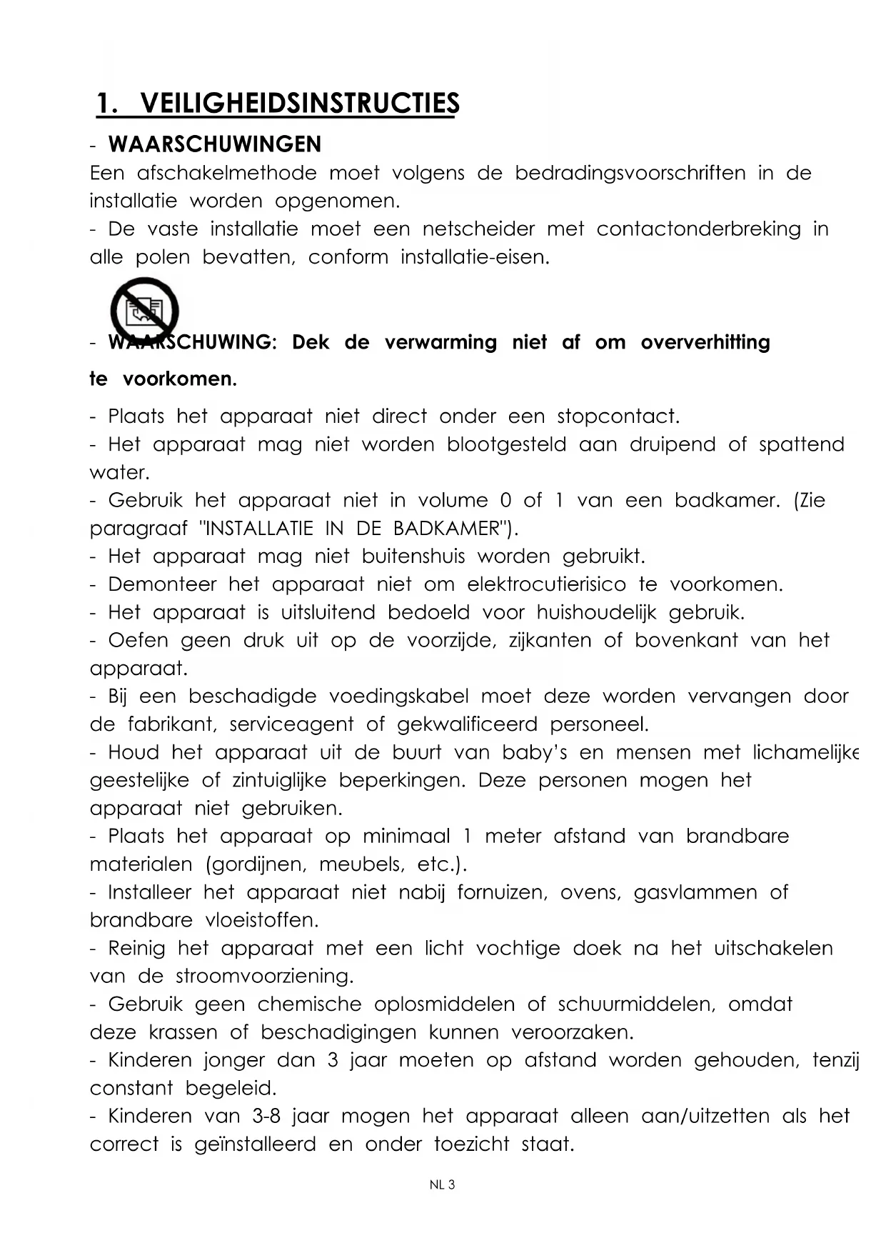 - WAARSCHUWINGEN Een afschakelmethode moet volgens de bedradingsvoorschriften in de installatie worden opgenomen. - De vaste installatie moet een netscheider met contactonderbreking in alle polen bevatten, conform installatie-eisen. - WAARSCHUWING: Dek de verwarming niet af om oververhitting te voorkomen. - Plaats het apparaat niet direct onder een stopcontact. - Het apparaat mag niet worden blootgesteld aan druipend of spattend water. - Gebruik het apparaat niet in volume 0 of 1 van een badkamer. (Zie paragraaf "INSTALLATIE IN DE BADKAMER"). - Het apparaat mag niet buitenshuis worden gebruikt. - Demonteer het apparaat niet om elektrocutierisico te voorkomen. - Het apparaat is uitsluitend bedoeld voor huishoudelijk gebruik. - Oefen geen druk uit op de voorzijde, zijkanten of bovenkant van het apparaat. - Bij een beschadigde voedingskabel moet deze worden vervangen door de fabrikant, serviceagent of gekwalificeerd personeel. - Houd het apparaat uit de buurt van baby’s en mensen met lichamelijke, geestelijke of zintuiglijke beperkingen. Deze personen mogen het apparaat niet gebruiken. - Plaats het apparaat op minimaal 1 meter afstand van brandbare materialen (gordijnen, meubels, etc.). - Installeer het apparaat niet nabij fornuizen, ovens, gasvlammen of brandbare vloeistoffen. - Reinig het apparaat met een licht vochtige doek na het uitschakelen van de stroomvoorziening. - Gebruik geen chemische oplosmiddelen of schuurmiddelen, omdat deze krassen of beschadigingen kunnen veroorzaken. - Kinderen jonger dan 3 jaar moeten op afstand worden gehouden, tenzij constant begeleid. - Kinderen van 3-8 jaar mogen het apparaat alleen aan/uitzetten als het correct is geïnstalleerd en onder toezicht staat.NL 4 - Kinderen van 3-8 jaar mogen het apparaat niet aansluiten, reinigen of onderhouden. WAARSCHUWING: Sommige onderdelen kunnen heet worden en brandwonden veroorzaken. Wees voorzichtig bij kinderen en kwetsbare personen. - De verwarming moet zo worden geïnstalleerd dat schakelaars niet bereikbaar zijn voor personen in bad of douche. - Het apparaat moet worden aangesloten via een aardlekschakelaar (RCD) met een reststroom van maximaal 30 mA. - Dit product voldoet aan EN60335-1, EN60335-2-30 en Richtlijn 2014/30/EU over elektromagnetische interferentie. - Voor montage-instructies met schroeven, zie de sectie "INSTALLATIE". - Dit apparaat kan worden gebruikt door kinderen vanaf 8 jaar en personen met beperkingen, mits onder toezicht en bewust van risico’s. - Kinderen mogen niet met het apparaat spelen. - Onderhoud en reiniging mogen niet door kinderen zonder toezicht worden uitgevoerd.