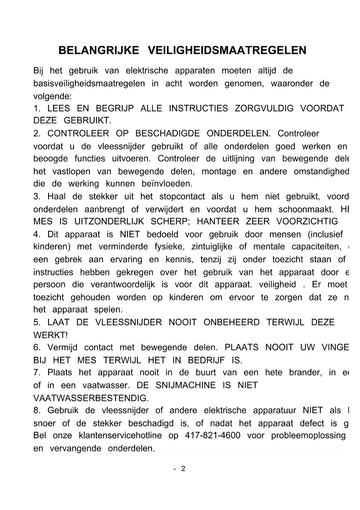Gebruik de vleessnijder of andere elektrische apparatuur NIET als I snoor of de stekker beschadigd is, of nadat het apparaat defect is g Bel once klantenservicehotline op 417-821-4600 voor probleemoplossing en verrangende onderdelen.