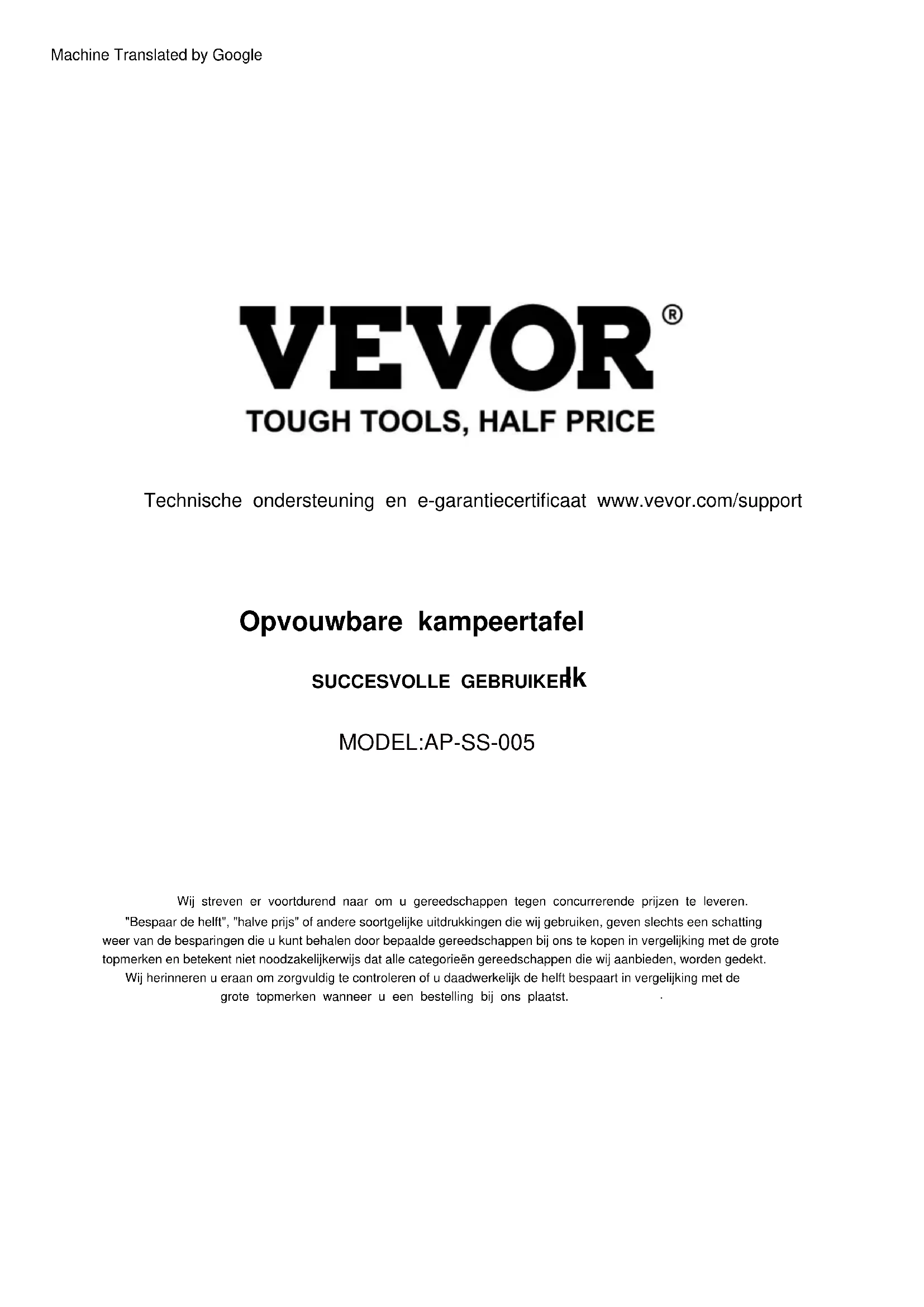 Technische ondersteuning en e-garantiecertificaat www.vevor.com/support Machine Translated by GoogleTechnische ondersteuning en e-garantiecertificaat www.vevor.com/support Hartelijk dank voor uw aankoop van een van onze producten. Lees de montage-instructies zorgvuldig door voordat u met de installatie begint.