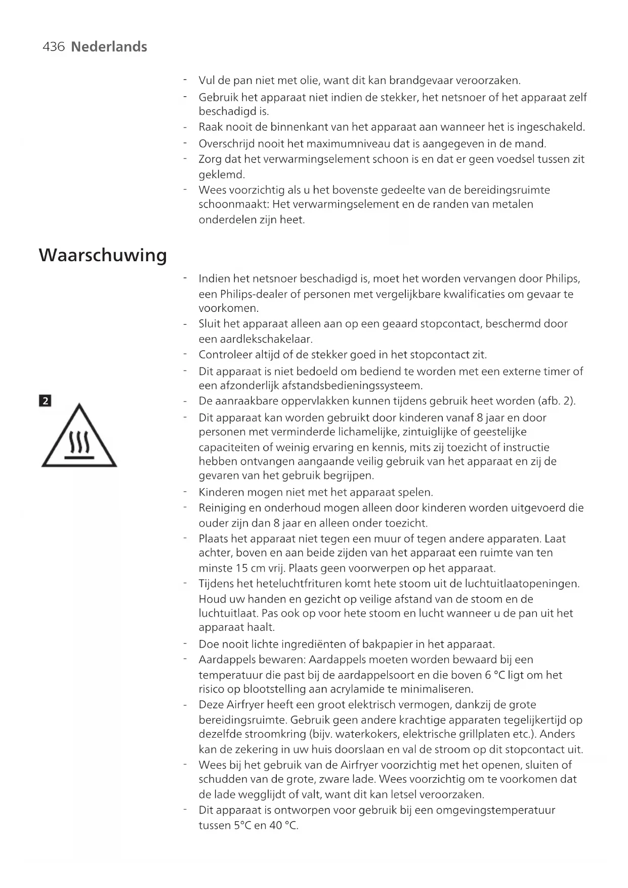 Zorg er altijd voor dat de verwijderbare onderdelen van de Airfryer vastzitten voordat u het apparaat oppakt en/of opbergt. Problemen oplossen Dit hoofdstuk behandelt in het kort de problemen die u kunt tegenkomen tijdens het gebruik van uw apparaat. Als u het probleem niet met de onderstaande informatie kunt oplossen, gaat u naar www.home.id voor een lijst met veelgestelde vragen of neemt u contact op met de klantenservice in uw land. Probleem Mogelijke oorzaak Oplossing De buitenkant van het apparaat wordt heet tijdens gebruik. De warmte in het apparaat straalt uit naar de buitenwanden. Dit is normaal. Alle gebieden die u tijdens het gebruik moet aanraken, blijven koel genoeg om aan te raken. De pan, de mand en de binnenzijde van het apparaat worden altijd heet wanneer het apparaat is ingeschakeld. Hierdoor wordt het gerecht goed gaar. Deze onderdelen zijn altijd te heet om aan te raken. Als u het apparaat langere tijd ingeschakeld laat, worden bepaalde delen te heet om aan te raken. Deze delen zijn op het apparaat gemarkeerd met het volgende pictogram: Zolang u zich bewust bent van de hete delen en u deze delen niet aanraakt, is het apparaat veilig om te gebruiken.468 Nederlands Probleem Mogelijke oorzaak Oplossing Mijn zelfgemaakte frites zijn niet goed gelukt. U hebt de verkeerde soort aardappelen gebruikt. Voor het beste resultaat gebruikt u verse, kruimige aardappelen. Bewaar de aardappelen niet op een koude plaats zoals in de koelkast. Kies aardappelen waarvan op de verpakking staat dat ze geschikt zijn voor frituren. De hoeveelheid etenswaren in de mand is te groot. Volg de instructies in deze gebruiksaanwijzing voor de bereiding van verse frites. Bepaalde etenswaren moeten halverwege de bereidingstijd worden geschud. Volg de instructies in deze gebruiksaanwijzing voor de bereiding van verse frites. De Airfryer kan niet worden ingeschakeld. De stekker van het apparaat zit niet in het stopcontact. Controleer of de stekker goed in het stopcontact is gestoken. Er zijn meerdere apparaten op één stopcontact aangesloten. De Airfryer heeft een hoog wattage. Probeer een ander stopcontact en controleer de stoppen. U hebt niet op de aan/uitknop gedrukt. Druk op de aan-uitknop om het apparaat in te schakelen. Ik zie wat afbladderingen in mijn Airfryer. In de pan van de Airfryer kunnen kleine plekjes ontstaan wanneer u de coating per ongeluk hebt aangeraakt of bekrast, bijvoorbeeld tijdens het reinigen met agressieve schoonmaakmiddelen en/of bij het plaatsen van de mand). U kunt beschadigingen voorkomen door de mand correct in de pan te plaatsen. Als u de mand onder een hoek laat zakken, kan de zijkant van de mand tegen de wand van de pan stoten, waardoor de coating beschadigd kan raken. Dit is echter niet schadelijk: alle gebruikte materialen zijn niet gevaarlijk als ze in uw voedsel terechtkomen. Er komt witte rook uit het apparaat. U bereidt vette etenswaren. Giet voorzichtig overtollige olie of overtollig vet uit de pan en zet vervolgens de bereiding voort. Er zitten nog vetresten in de pan van de vorige keer. Witte rook wordt veroorzaakt door vetresten die in de pan worden verhit. Reinig de pan en de mand grondig na elk gebruik. Een paneerlaag of omhulling is niet goed aan de etenswaren vast blijven zitten. Kleine rondzwevende stukjes van een paneerlaag of omhulling kunnen witte rook veroorzaken. Druk een paneerlaag of omhulling stevig op de etenswaren om er zeker van te zijn dat deze goed blijft zitten.469 Nederlands Probleem Mogelijke oorzaak Oplossing Marinade, vloeistof of vleessap spat in de olie of het gesmolten vet. Dep het voedsel droog voordat u het in het mandje plaatst. Op het scherm van de Airfryer wordt 'E1' weergegeven. Mogelijk bewaart u de Airfryer op een te koude plek. Als u het apparaat hebt bewaard op een koude plek, laat u het eerst minstens 15 minuten opwarmen tot kamertemperatuur voordat u het weer aansluit. Als er nog steeds 'E1' op het display wordt weergegeven, belt u de helpdesk van Philips of neemt u contact op met de klantenservice in uw land. Op het scherm van de Airfryer wordt 'E4–E12' weergegeven. Het apparaat heeft mogelijk een technische storing. Trek de stekker van het apparaat uit het stopcontact en steek deze er vervolgens weer in. Als dit niet helpt, belt u de helpdesk van Philips of neemt u contact op met de klantenservice in uw land. Op het scherm van de Airfryer wordt 'E15' weergegeven. De interne waterslang is verstopt. Voer het ontkalkingsproces uit. Als dit niet helpt, belt u de helpdesk van Philips of neemt u contact op met de klantenservice in uw land. Ik hoor een vreemd geluid uit de binnenkant van het apparaat. Dit apparaat is uitgerust met een ventilator om warmte te circuleren en een waterpomp om de stoomfunctie mogelijk te maken. Tijdens het gebruik kunt u uit deze onderdelen geluiden horen. Dit is normaal en is te verwachten. Als het geluid merkbaar luider wordt of als het anders begint te klinken, kunt u contact opnemen met de klantenservice voor verdere hulp. Er zit na de bereiding water in de bereidingsruimte. Na het koken kunt u zien dat er water in de bereidingsruimte achterblijft. Dit komt door de tijdens het gebruik gegenereerde stoom. Deze condenseert op het voedsel en de binnenwanden van de ruimte. Een kleine hoeveelheid condensatie is normaal. Veeg het apparaat gewoon af met een zachte, vochtige, niet- schurende doek. knippert. Geen water in het waterreservoir. Voeg gezuiverd water aan het waterreservoir toe. Het waterreservoir is niet goed geplaatst. Druk op het waterreservoir om goed te plaatsen.470 Nederlands Probleem Mogelijke oorzaak Oplossing De interne waterslang is verstopt. Voer het ontkalkingsproces uit. Als dit niet helpt, belt u de helpdesk van Philips of neemt u contact op met de klantenservice in uw land. knippert. Dit is de ontkalkingsherinnering. Voer het ontkalkingsproces uit. Zie het hoofdstuk 'Ontkalken'. Er kan tijdens het stomen, bereiden met hete lucht en stoom of ontkalken wat condens op de wand ont