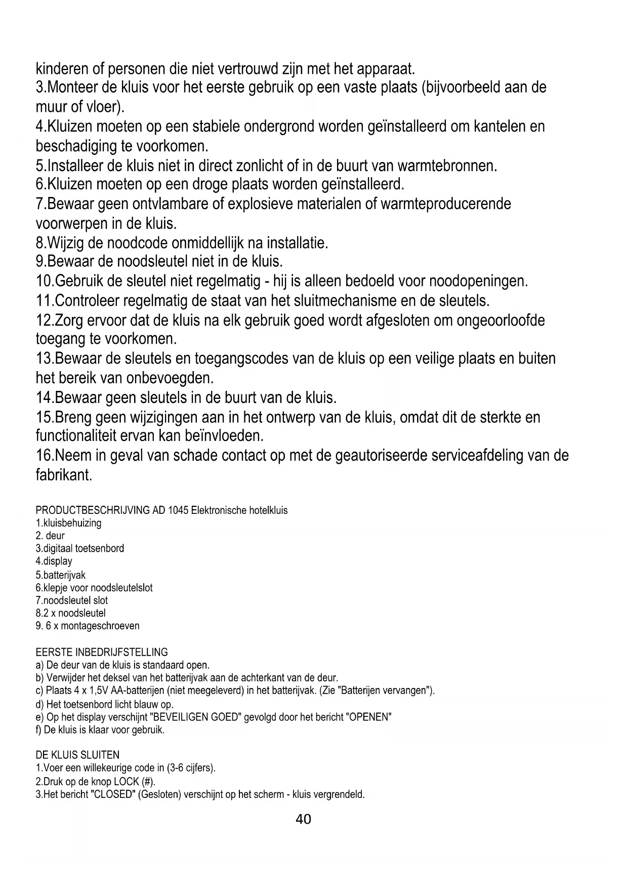 ZORGVULDIG LEZEN EN BEWAREN VOOR TOEKOMSTIG GEBRUIK 1.Lees de gebruiksaanwijzing voordat u het apparaat in gebruik neemt en volg de aanwijzingen op. De fabrikant is niet aansprakelijk voor schade veroorzaakt door gebruik van het apparaat dat niet overeenstemt met het bedoelde gebruik of door onjuist gebruik. 2.Wees extra voorzichtig wanneer u het apparaat gebruikt in de buurt van kinderen. Laat kinderen niet met het apparaat spelen en laat het apparaat niet gebruiken door40 kinderen of personen die niet vertrouwd zijn met het apparaat. 3.Monteer de kluis voor het eerste gebruik op een vaste plaats (bijvoorbeeld aan de muur of vloer). 4.Kluizen moeten op een stabiele ondergrond worden geïnstalleerd om kantelen en beschadiging te voorkomen. 5.Installeer de kluis niet in direct zonlicht of in de buurt van warmtebronnen. 6.Kluizen moeten op een droge plaats worden geïnstalleerd. 7.Bewaar geen ontvlambare of explosieve materialen of warmteproducerende voorwerpen in de kluis. 8.Wijzig de noodcode onmiddellijk na installatie. 9.Bewaar de noodsleutel niet in de kluis. 10.Gebruik de sleutel niet regelmatig - hij is alleen bedoeld voor noodopeningen. 11.Controleer regelmatig de staat van het sluitmechanisme en de sleutels. 12.Zorg ervoor dat de kluis na elk gebruik goed wordt afgesloten om ongeoorloofde toegang te voorkomen. 13.Bewaar de sleutels en toegangscodes van de kluis op een veilige plaats en buiten het bereik van onbevoegden. 14.Bewaar geen sleutels in de buurt van de kluis. 15.Breng geen wijzigingen aan in het ontwerp van de kluis, omdat dit de sterkte en functionaliteit ervan kan beïnvloeden. 16.Neem in geval van schade contact op met de geautoriseerde serviceafdeling van de fabrikant. PRODUCTBESCHRIJVING AD 1045 Elektronische hotelkluis 1.kluisbehuizing