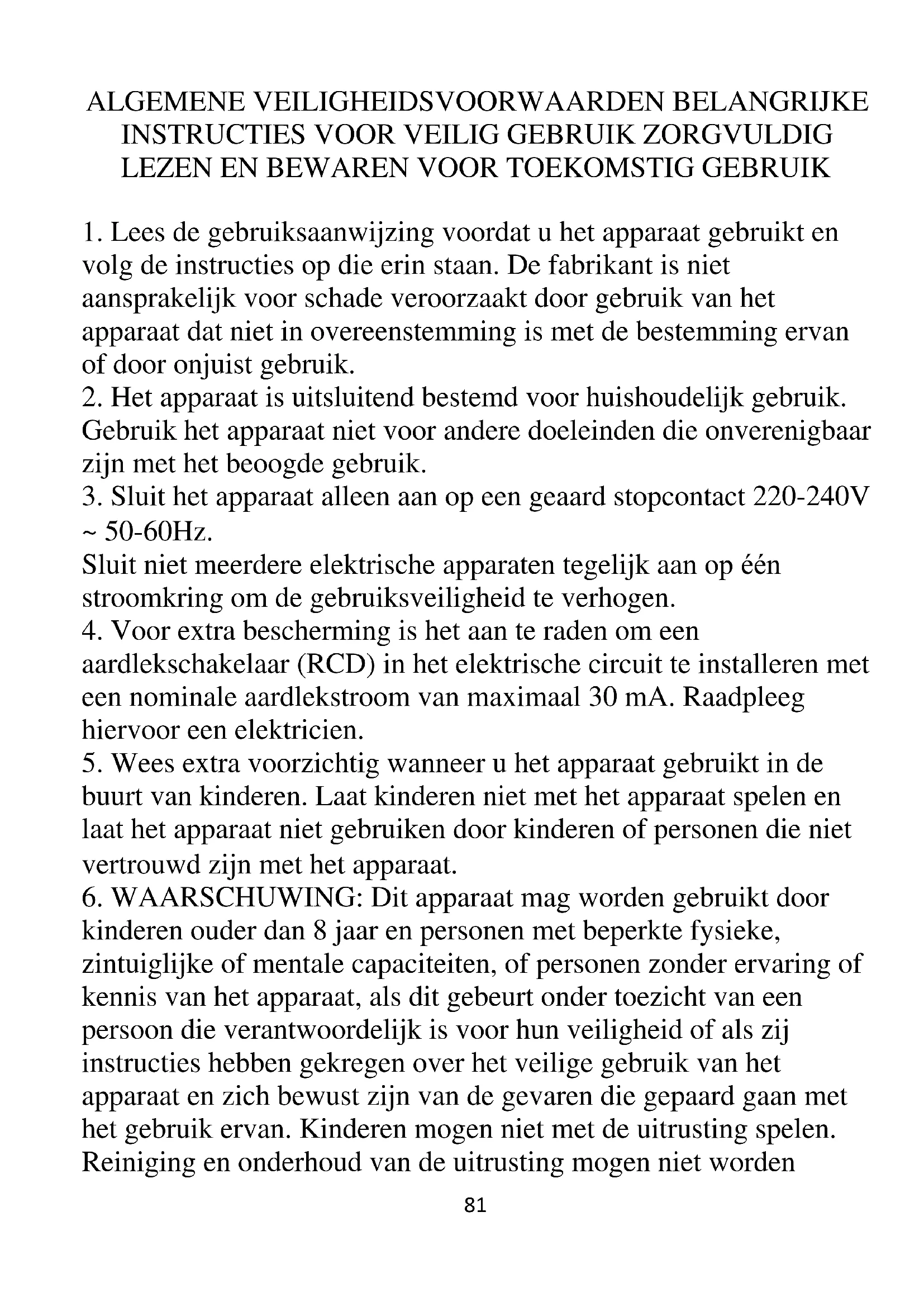 kinderen ouder dan 8 jaar en personen met beperkte fysieke, zintuiglijke of mentale capaciteiten, of personen zonder ervaring of kennis van het apparaat, als dit gebeurt onder toezicht van een persoon die verantwoordelijk is voor hun veiligheid of als zij instructies hebben gekregen over het veilige gebruik van het apparaat en zich bewust zijn van de gevaren die gepaard gaan met het gebruik ervan. Kinderen mogen niet met de uitrusting spelen. Reiniging en onderhoud van de uitrusting mogen niet worden82 uitgevoerd door kinderen, tenzij ze ouder zijn dan 8 jaar en de activiteit onder toezicht wordt uitgevoerd.
