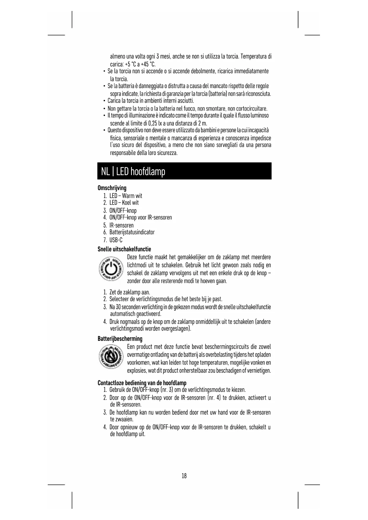 verlichtingsmodi worden overgeslagen). Batterijbescherming Een product met deze functie bevat beschermingscircuits die zowel overmatige ontlading van de batterij als overbelasting tijdens het opladen voorkomen, wat kan leiden tot hoge temperaturen, mogelijke vonken en explosies, wat dit product onherstelbaar zou beschadigen of vernietigen. Contactloze bediening van de hoofdlamp