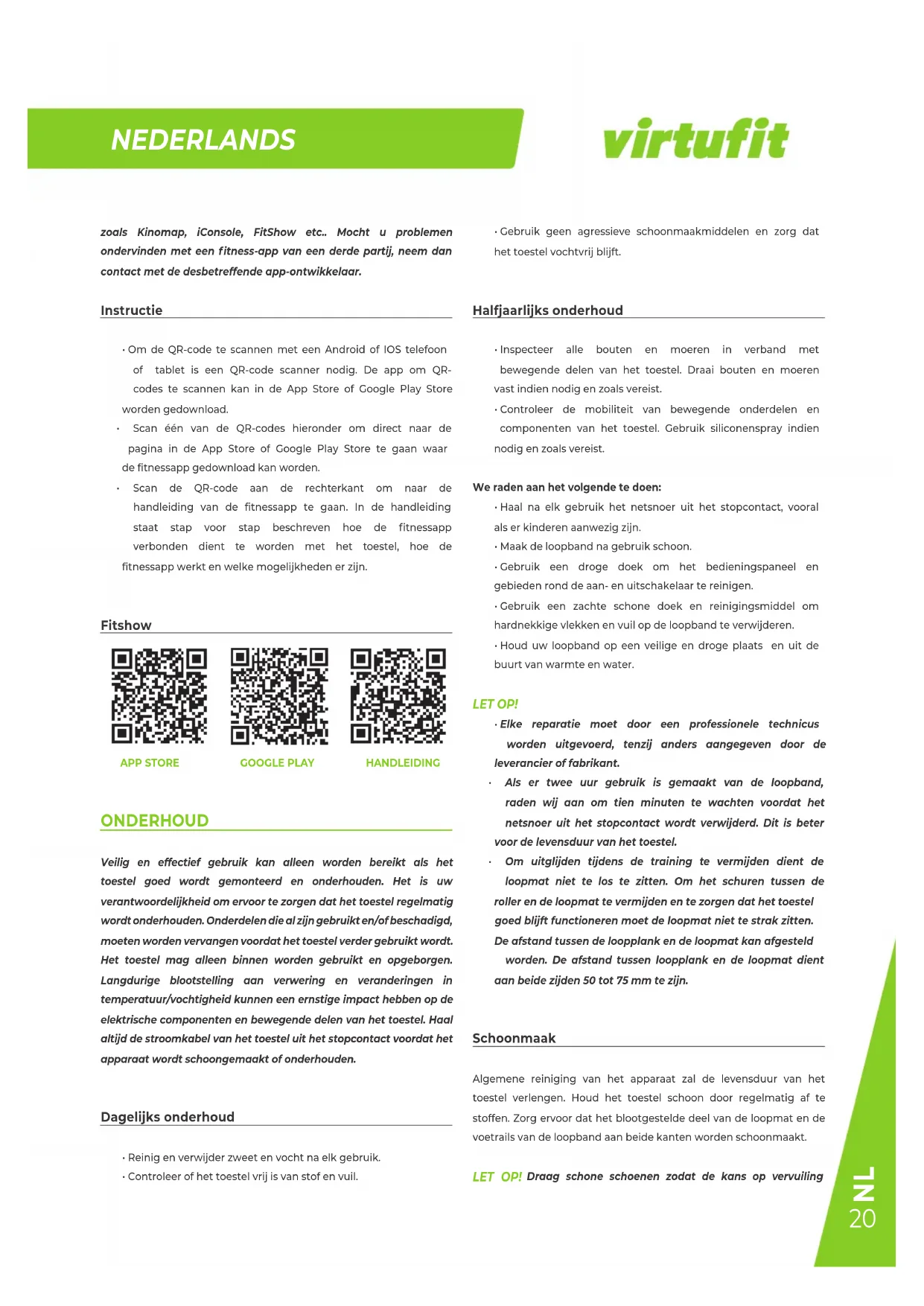 INHOUD Veiligheidsinstructies 18 Garantie 18 Montage Instructies 18 Afstellen 19 In- en uitklapinstructies 19 Trainen met hartslag 19 Trainen met fitness apps 20 Onderhoud 20 Insmeren van de loopband 21 Console 21 Handmatige modus 22 Programma’s 22 Trainingsrichtlijnen 23 VEILIGHEIDSINSTRUCTIES WAARSCHUWING! Raadpleeg uw arts voordat u begint met trainen. Dit is in het bijzonder belangrijk voor personen met gezondheidsproblemen. Lees alle instructies alvorens het toestel gebruikt wordt. VirtuFit neemt geen verantwoordelijkheid voor geleden letsel of materiële schade door het gebruik van dit toestel. Lees deze handleiding zorgvuldig door, voordat u begint met monteren van het toestel en/of er gebruik van gaat maken.