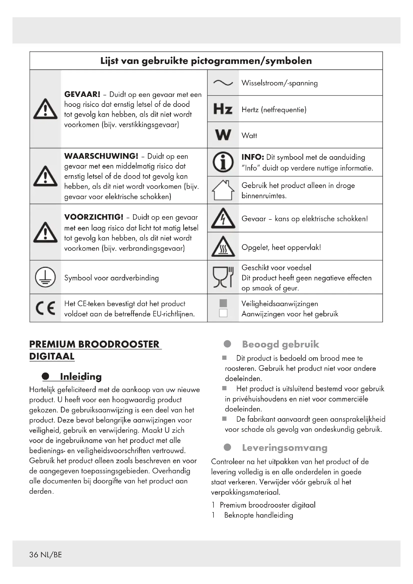 Beoogd gebruik Dit product is bedoeld om brood mee te roosteren. Gebruik het product niet voor andere doeleinden. Het product is uitsluitend bestemd voor gebruik in privéhuishoudens en niet voor commerciële doeleinden. De fabrikant aanvaardt geen aansprakelijkheid voor schade als gevolg van ondeskundig gebruik. Leveringsomvang Controleer na het uitpakken van het product of de levering volledig is en alle onderdelen in goede staat verkeren . Verwijder vóór gebruik al het verpakkingsmateriaal. 1 Premium broodrooster digitaal 1 Beknopte handleiding37NL/BE Onderdelenbeschrijving Vouw voor het lezen de uitklapbare bladzijde met de tekeningen uit. Maak u vertrouwd met alle functies van het product. [1] Toastsleuven [2] Timer-indicator [3] – (toets bruiningsniveau verlagen) [4] + (toets bruiningsniveau verhogen) [5] (ontdooitoets met indicatielampje) [6] (stoptoets) [7] (opwarmtoets met indicatielampje) [8] Broodjesopzetstuk [9] Voeten [] Snoerhaspel [] Snoerklem [] Aansluitsnoer met netstekker [] Kruimellade [] Uitklaphendel (voor broodjesopzetstuk) [] Bruiningsniveau-indicator [] Start/broodlifthendel Technische gegevens Voedingsspanning: 220–240V∼, 50–60Hz Energieverbruik: 730–870W Energieverbruik wanneer uitgeschakeld: 0,2W Beschermingsklasse: I Certificering: GS (TÜV Rheinland) Veiligheidsaanwijzingen