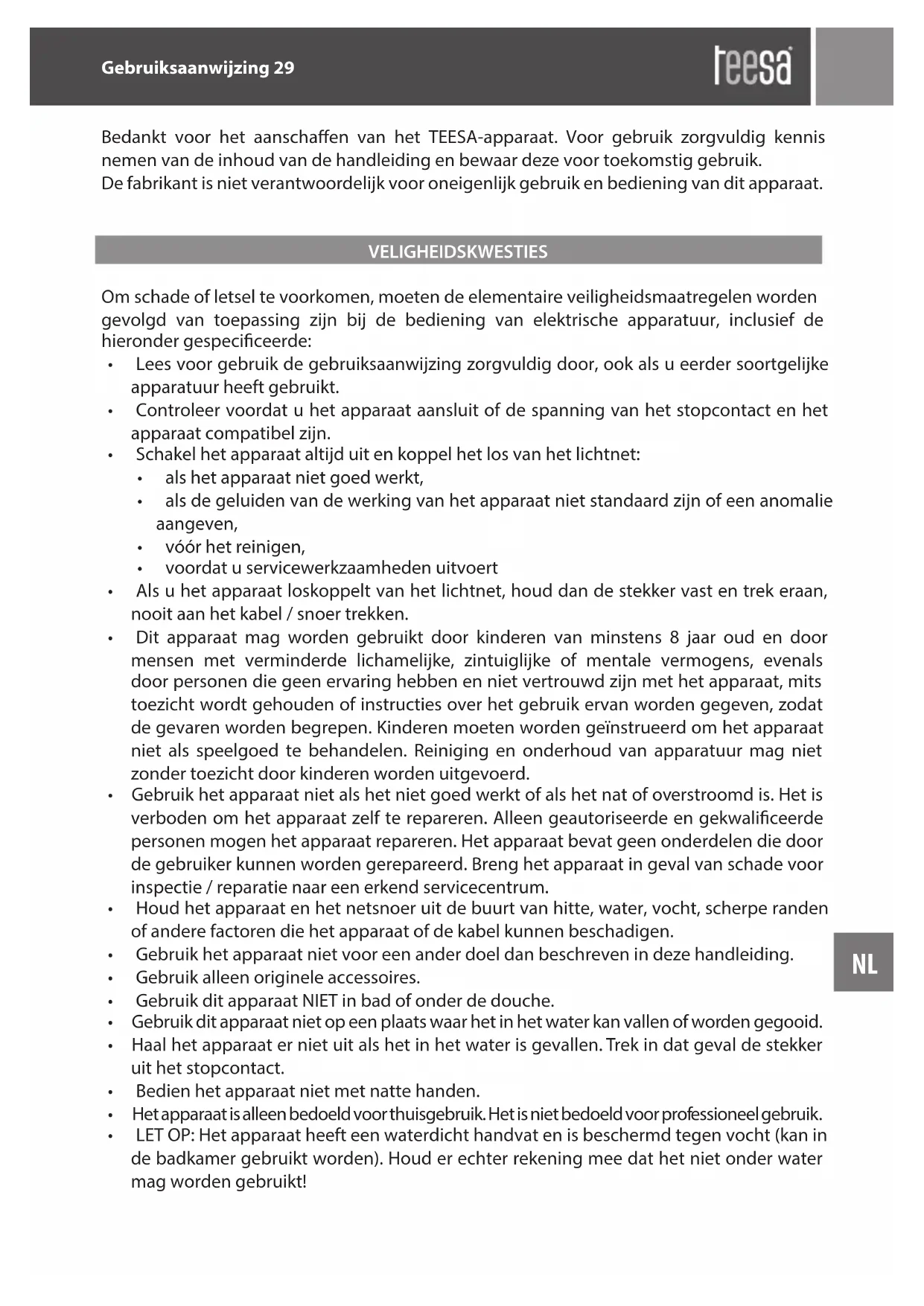 Bedankt voor het aanschaen van het TEESA-apparaat. Voor gebruik zorgvuldig kennis nemen van de inhoud van de handleiding en bewaar deze voor toekomstig gebruik. De fabrikant is niet verantwoordelijk voor oneigenlijk gebruik en bediening van dit apparaat. Om schade of letsel te voorkomen, moeten de elementaire veiligheidsmaatregelen worden gevolgd van toepassing zijn bij de bediening van elektrische apparatuur, inclusief de hieronder gespeciceerde: