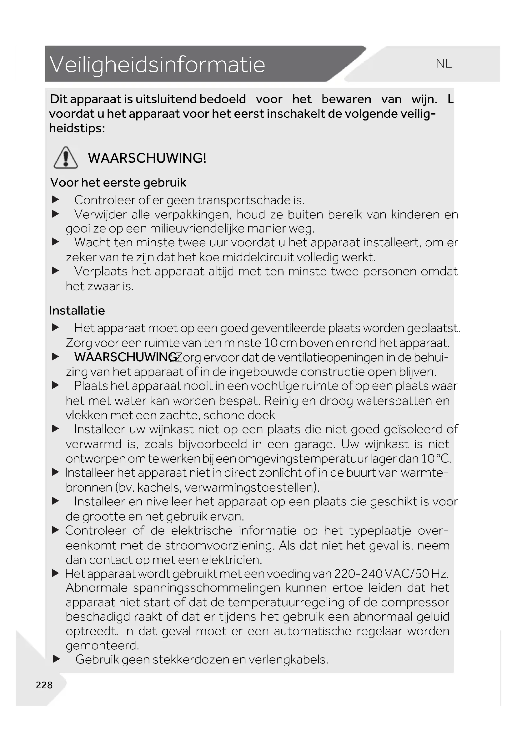 1-Veiligheidsinformatie Íì÷äóóäõää÷ìöøì÷öïøì÷èñçåèçòèïç ùòòõ ëè÷ åèúäõèñ ùäñ úìíñ Õèèö ùòòõçä÷øëè÷äóóäõää÷ùòòõëè÷èèõö÷ìñöæëäîèï÷çèùòïêèñçèùèìïìê¡ ëèìçö÷ìóö àÊÊÛÜÌÑÞàÒ×Ð ßòòõëè÷èèõö÷èêèåõøìî f Controleer of er geen transportschade is. f Verwijder alle verpakkingen, houd ze buiten bereik van kinderen en gooi ze op een milieuvriendelijke manier weg. f Wacht ten minste twee uur voordat u het apparaat installeert, om er zeker van te zijn dat het koelmiddelcircuit volledig werkt. f Verplaats het apparaat altijd met ten minste twee personen omdat het zwaar is. Òñö÷äïïä÷ìè f Het apparaat moet op een goed geventileerde plaats worden geplaatst. Zorg voor een ruimte van ten minste 10 cm boven en rond het apparaat. f àÊÊÛÜÌÑÞàÒ×Ð: Zorg ervoor dat de ventilatieopeningen in de behui- zing van het apparaat of in de ingebouwde constructie open blijven. f Plaats het apparaat nooit in een vochtige ruimte of op een plaats waar het met water kan worden bespat. Reinig en droog waterspatten en vlekken met een zachte, schone doek f Installeer uw wijnkast niet op een plaats die niet goed geïsoleerd of verwarmd is, zoals bijvoorbeeld in een garage. Uw wijnkast is niet ontworpen om te werken bij een omgevingstemperatuur lager dan 10 °C. f Installeer het apparaat niet in direct zonlicht of in de buurt van warmte- bronnen (bv. kachels, verwarmingstoestellen). f Installeer en nivelleer het apparaat op een plaats die geschikt is voor de grootte en het gebruik ervan. f Controleer of de elektrische informatie op het typeplaatje over- eenkomt met de stroomvoorziening. Als dat niet het geval is, neem dan contact op met een elektricien. f Het apparaat wordt gebruikt met een voeding van 220-240 VAC/50 Hz. Abnormale spanningsschommelingen kunnen ertoe leiden dat het apparaat niet start of dat de temperatuurregeling of de compressor beschadigd raakt of dat er tijdens het gebruik een abnormaal geluid optreedt. In dat geval moet er een automatische regelaar worden gemonteerd. f Gebruik geen stekkerdozen en verlengkabels.NL Veiligheidsinformatie