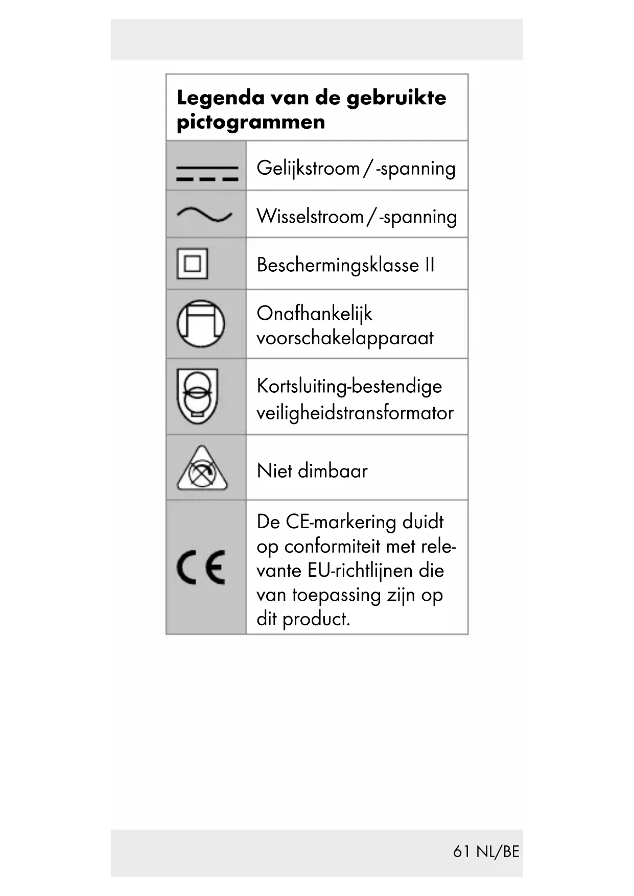 aan het stroomnet verbindt. Trek de stroomadapter met stek- ker voor de montage, demon- tage en reiniging altijd uit het stopcontact. Dit product bevat geen onder- delen die door de gebruiker kunnen worden onderhouden. De leds en de led-driver kunnen niet worden vervangen. Het product is uitsluitend ge- schikt voor gebruik met de mee- geleverde stroomadapter met stekker (SPA120025VL-01). Gebruik het product niet als het is afgedekt of in een oppervlak is verzonken. Verbind het product alleen met de meegeleverde verbindingska- bels. Open uiteinden moeten worden gesloten voordat het product wordt gebruikt.69 NL/BE Verbind dit product niet met een led-band van een andere fabrikant. Houd er rekening mee dat de stroomadapter met stekker ook zonder gebruik van het product nog een gering vermogen op- neemt, zolang deze zich in het stopcontact bevindt. Voor het volledig uitschakelen haalt u de stroomadapter met stekker uit het stopcontact. De verlichtingsmiddelen kunnen niet worden vervangen. Mochten de verlichtingsmiddelen aan het einde van hun levensduur uitvallen, dan dient het gehele product te worden vervangen. Gebruik de led-band niet als deze is afgedekt of in een op- pervlak is verzonken. Het aaneenschakelen is alleen mogelijk door gebruik van de meegeleverde steek-verbinder. Alle open eindstukken moeten voor gebruik worden geïsoleerd.70 NL/BE Verbind de led-band niet met een product van een andere fabrikant. Voor de ingebruikname