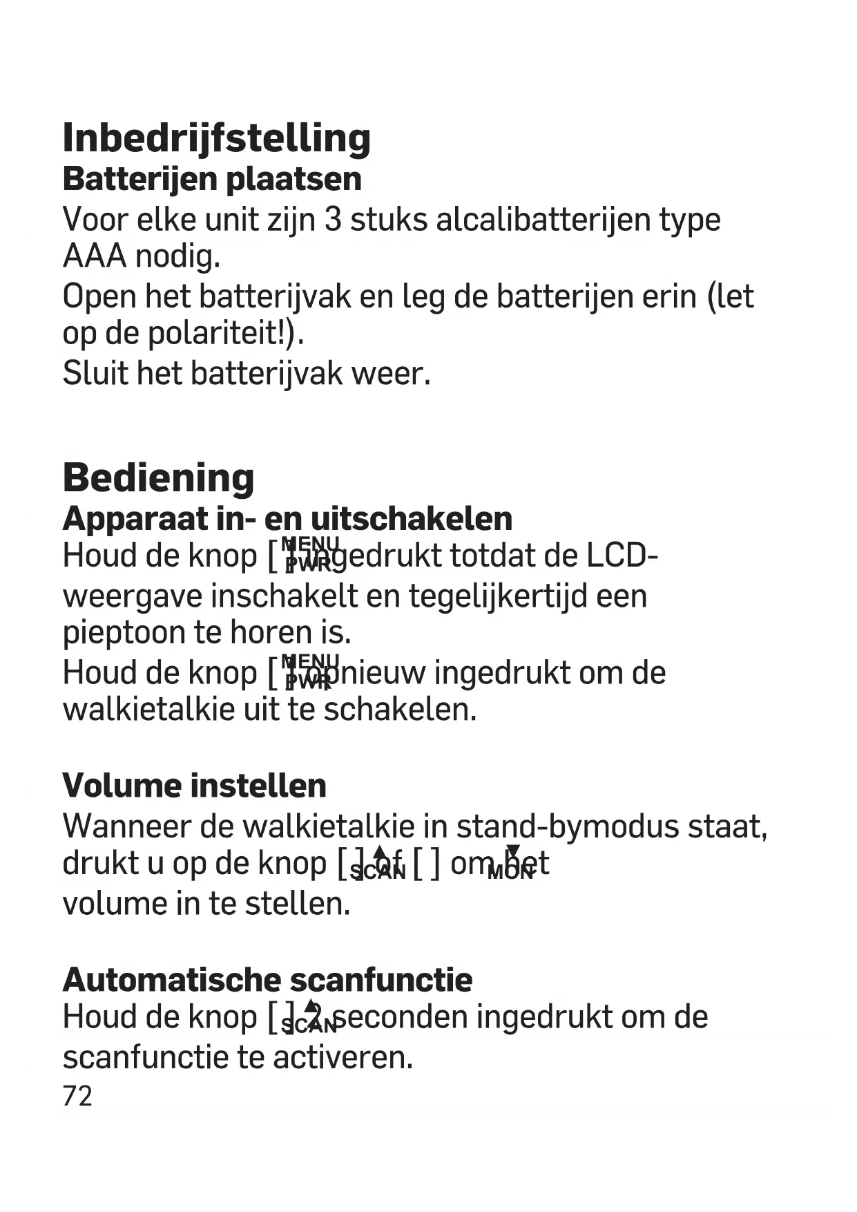 WTE2350 2353 2354 Walkietalkie 2 3 4 Riemclips 2 3 4 Gebruikshandleiding 1 1 1Inbedrijfstelling Batterijen plaatsen Voor elke unit zijn 3 stuks alcalibatterijen type AAA nodig. Open het batterijvak en leg de batterijen erin (let op de polariteit!). Sluit het batterijvak weer. Bediening Apparaat in- en uitschakelen Houd de knop [ ] ingedrukt totdat de LCD- weergave inschakelt en tegelijkertijd een pieptoon te horen is. Houd de knop [ ] opnieuw ingedrukt om de walkietalkie uit te schakelen. Volume instellen Wanneer de walkietalkie in stand-bymodus staat, drukt u op de knop [ ] of [ ] om het volume in te stellen. Automatische scanfunctie Houd de knop [ ] 2 seconden ingedrukt om de scanfunctie te activeren. MENU PWR MENU PWR