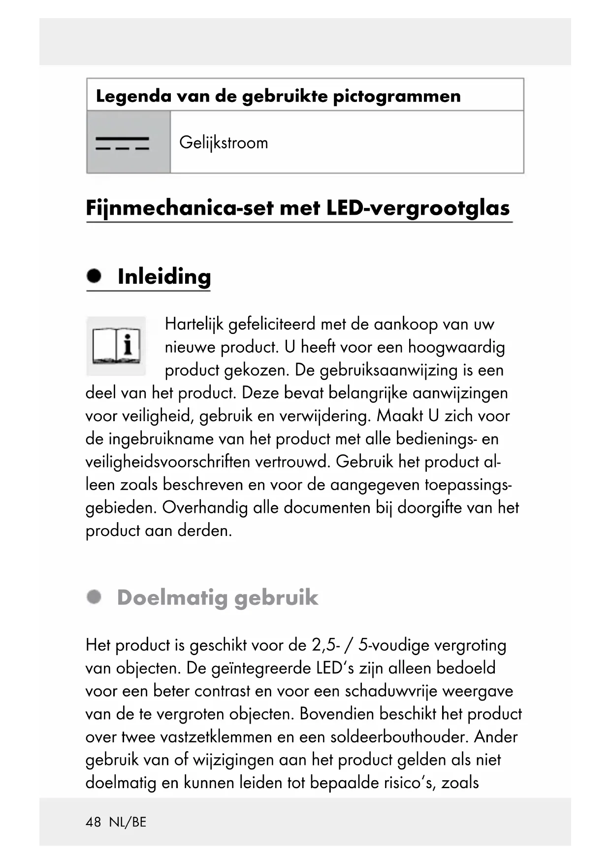 Band (binnenin het batterijvak) Technische gegevens Bedrijfsspanning: 4,5 volt Batterijen: 3 x 1,5 V , AAA-type Max. nominaal vermogen: 2 x 0,06 W Lampjes: 2 x led (niet vervangbaar) Vergroting / loep: 2,5- / 5-voudig Afmetingen: ca. 23 x 12 x 16 cm (L x B x H) Kleurkwaliteit: X < 0,27 of X > 0,530; Y < -2,3172 X + 2,3653 X – 0,2199 of Y > -2,3172 X + 2,3653 X - 0,1595 Inhoud van de levering Controleer direkt na het uitpakken de omvang van de levering op volledigheid alsook de onberispelijke staat van het product en alle onderdelen. Gebruik het product in geen geval, als de omvang van de levering niet volledig is.51 NL/BE 1 mechanica LED-loep 3 batterijen 1,5 V , AAA-type 1 gebruiksaanwijzing Veiligheid Algemene veiligheidsinstructies