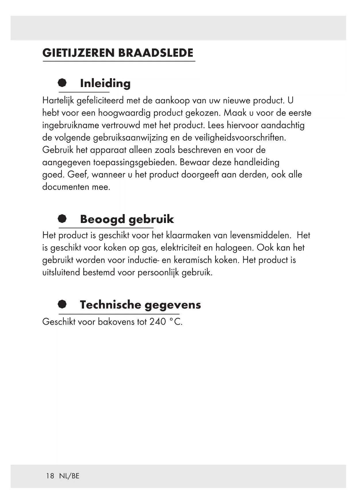 ATTENTION ! Veuillez noter que l'émail peut être endommagé lors d'une chute ou d'un choc. § Recyclage L’emballage se compose de matières recyclables qui peuvent être mises au rebut dans les déchetteries locales. Les possibilités de recyclage des produits usés sont à demander auprès de votre municipalité.18 NL/BE GIETIJZEREN BRAADSLEDE § Inleiding Hartelijk gefeliciteerd met de aankoop van uw nieuwe product. U hebt voor een hoogwaardig product gekozen. Maak u voor de eerste ingebruikname vertrouwd met het product. Lees hiervoor aandachtig de volgende gebruiksaanwijzing en de veiligheidsvoorschriften. Gebruik het apparaat alleen zoals beschreven en voor de aangegeven toepassingsgebieden. Bewaar deze handleiding goed. Geef, wanneer u het product doorgeeft aan derden, ook alle documenten mee. § Beoogd gebruik Het product is geschikt voor het klaarmaken van levensmiddelen. Het is geschikt voor koken op gas, elektriciteit en halogeen. Ook kan het gebruikt worden voor inductie- en keramisch koken. Het product is uitsluitend bestemd voor persoonlijk gebruik. § Technische gegevens Geschikt voor bakovens tot 240 °C.19 NL/BE Veiligheidsaanwijzingen
