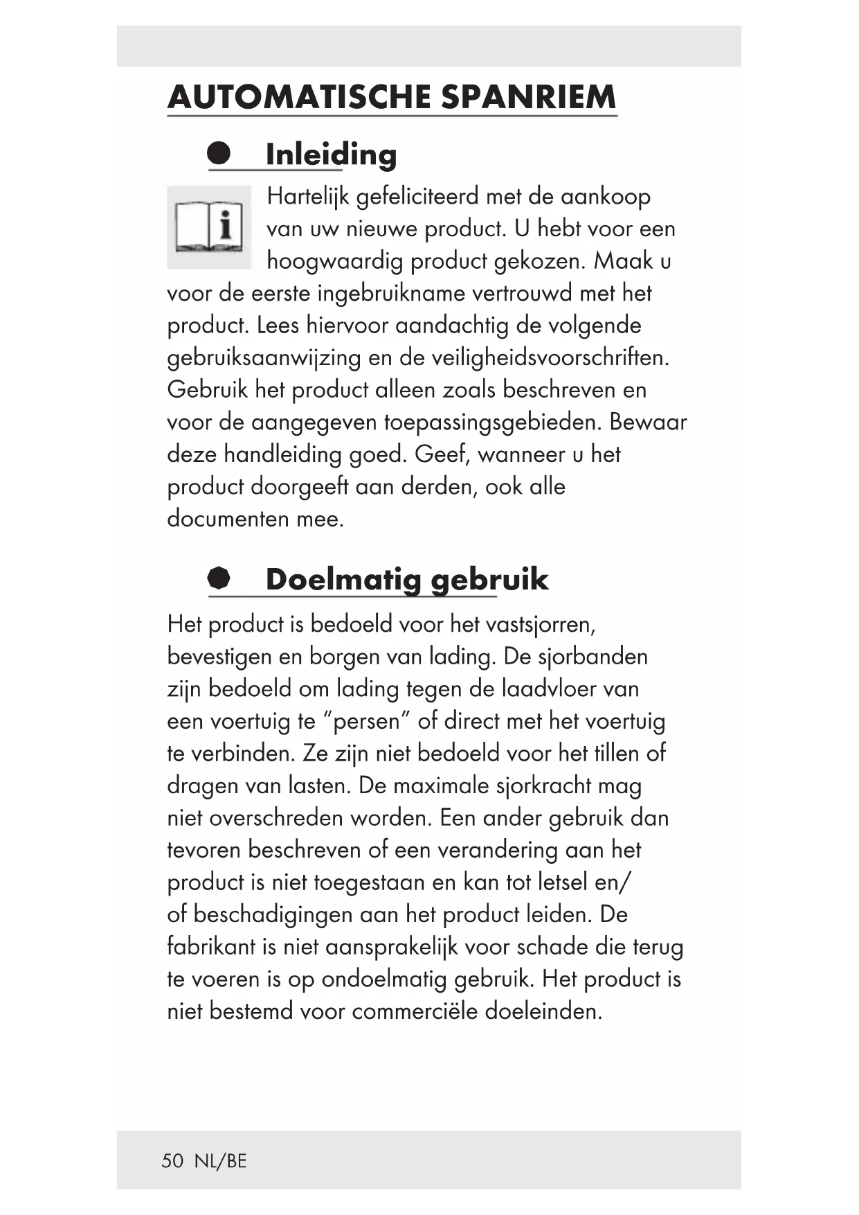 JONGEREN! Laat kinderen nooit zonder toezicht hanteren met het verpakkingsmateriaal of het product. Er bestaat gevaar voor verstikking door verpakkingsmateriaal en levensgevaar door wurgen. Kinderen onderschatten de gevaren vaak. Houd kinderen steeds verwijderd van het product. Dit product is géén speelgoed. Gebruik het product niet meer als het beschadigd is. Controleer of alle onderdelen op de voorgeschreven wijze gemonteerd zijn. Bij ondeskundige montage bestaat gevaar voor letsel. Veiligheidsinstructies voor sjorbanden Controleer de sjorband vóór ieder gebruik op mogelijke schade. Gebruik de sjorband in géén geval als hij beschadigingen vertoont. Controleer vooral met uiterste zorg sjorbanden die in contact zijn gekomen met gevaarlijke stoffen of die verontreinigd zijn. Laat deze53 NL/BE eventueel door de fabrikant controleren. Laat de sjorbanden en alle bijbehorende onderdelen minstens eenmaal per jaar controleren door een vakman. Al naargelang de gebruiksomstandigheden en de bedrijfssituatie kunnen tussentijdse controles door een vakman nodig zijn. Gebruik de sjorband in géén geval bij: - draadbreuken of –insnijdingen, vooral inkepingen aan de rand of andere bedenkelijke beschadigingen - ontbrekende of onleesbaar geworden kenmerking - beschadigingen aan de verbindingen, vervormingen door warmte-invloed (wrijving, straling) - schade als gevolg van contact met agressieve stoffen Gebruik de ratels in géén geval bij: - scheuren, breuken of aanzienlijke roestvorming of -schade - verwijding > 5 % (5 % in de haakbek of algemene vervormingen) - zichtbare, blijvende vervorming van dragende delen Reparaties aan sjorbanden mogen alleen worden uitgevoerd als de kenmerking van de fabrikant, het materiaal en de geoorloofde trekkracht op het etiket duidelijk te lezen zijn. Deze reparaties mogen alleen worden uitgevoerd door de fabrikant of door hem daartoe geautoriseerde personen. Zij dienen54 NL/BE te waarborgen dat de na de reparatie weer gebruiksklare sjorbanden de oorspronkelijk op het etiket aangegeven maximaal geoorloofde trekkracht bereiken. Belast de sjorbanden nooit zwaarder dan op het etiket als geoorloofde trekkracht vermeld staat (zie ook “Technische gegevens”). Kies de geschikte sjorband voor de desbetreffende sjorwijze, trekkracht en laadvloer (zie kenmerking op het etiket). m VOORZICHTIG! GEVAAR VOOR ONGEVALLEN! Kies steeds de geschikte sjorbanden, sjorpunten en sjormethode. Niet alleen de afmetingen, de vorm en het gewicht van de lading, maar ook de geplande gebruikswijze, de transportomgeving en de soort lading zijn bepalend voor de juiste keuze. Overtuig u ervan dat de voertuigdelen waaraan de lading bevestigd moet worden, ook voldoende stabiel zijn. m VOORZICHTIG! Naast de versnellingskrachten tijdens het rijden kunnen ook zijdelingse krachten ontstaan door bijv. wind. Trek sjorbanden nooit over ruwe oppervlakken of scherpe randen als deze niet van een geschikte bescherming voorzien zijn. Let op dat de sjorbanden niet verdraaien, maar over de hele breedte dragen.55 NL/BE Plaats geen voorwerpen op de sjorband als deze daardoor beschadigd kan raken. Houd de sjorband verwijderd van hete oppervlakken. Verdeel de sjorbanden gelijkmatig over de te borgen lading. Gebruik sjorbanden nooit als aanslagmiddel. Let op dat de S-haken niet op hun punt belast worden, tenzij het haken betreft die voor dit speciale doeleinde geschikt is. Haak sjorhaken altijd van buiten naar binnen vast. Zo voorkomt u loshaken zonder borging in een sjorpunt op de laadvloer. Leg de S-haken en de ratels nooit tegen kanten aan. Verleng de ratelgreep niet om grotere spankrachten te bereiken als dit in de desbetreffende gebruiksaanwijzing niet uitdrukkelijk wordt toegestaan. m VOORZICHTIG! GEVAAR VOOR ONGEVALLEN! Bij gebruik van extra aanslagmiddelen en sjorvoorzieningen bij het sjorren moet worden opgelet dat deze bij de sjorband passen. Span de sjorband handmatig zo ver dat niet meer dan 3 bandwikkelingen op de ratel moeten worden gebracht om de lading te spannen. Bij daklading mogen de maximumgegevens van de fabrikant nooit overschreden worden.56 NL/BE m VOORZICHTIG! GEVAAR VOOR ONGEVALLEN! Let bij het neersjorren op de vereiste voorspankracht. U hebt minstens 2 sjorbanden nodig. Gebruik omwille van de stabiliteit minimaal twee identieke sjorbanden voor het neersjorren en twee paar identieke sjorbanden bij het diagonaalsjorren. m VOORZICHTIG! GEVAAR VOOR ONGEVALLEN! Controleer tijdens de rit regelmatig of de lading nog correct bevestigd is en span de sjorbanden eventueel nog een keer. § Praktische tips voor het gebruik en het onderhoud van sjorbanden