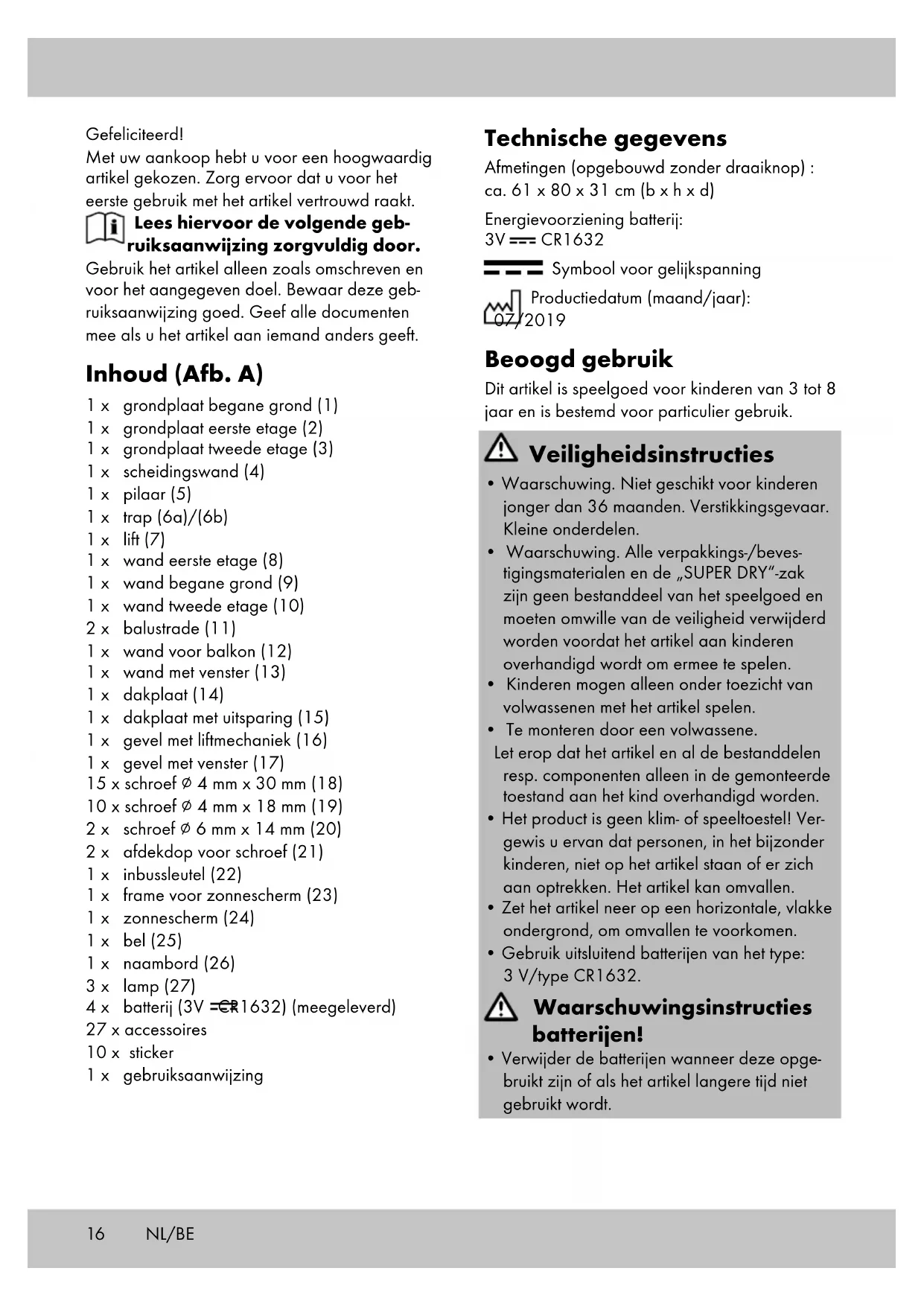 de lamp (27) weer vast en bevestig de bel resp. de lamp weer aan het poppenhuis. Opslag, reiniging Bewaar het artikel wanneer u dit niet gebruikt altijd droog, schoon en zonder batterijen op kamertemperatuur. Veeg alleen schoon met een droge schoonmaak- doek. BELANGRIJK! Reinig nooit met agressieve reini- gingsmiddelen. Afvalverwerking Voer het artikel en verpakkingsmaterialen in overeenstemming met actuele lokale voor- schriften af. Verpakkingsmaterialen, zoals bv. foliezakjes, horen niet thuis in kinderhanden. Berg het verpakkingsmateriaal buiten het bereik van kinderen op. Voer de producten en verpakkingen op milieuvriendelijke wijze af. De recyclingcode dient om verschillende materialen te kenmerken ten behoeve van hergebruik via het recyclingproces. De code bestaat uit het recyclingsymbool, dat het recyclingproces weerspiegelt, en een getal dat het materiaal identificeert. Apparaten die met het hiernaast afgebe- elde symbool gemarkeerd zijn, mogen niet samen met het huisvuil afgevoerd worden. U bent verplicht, dergelijke oude elektrische en elektronische apparaten afzonderlijk af te voeren. Gelieve bij uw gemeentebestuur naar de moge- lijkheden van een reguliere afvalverwijdering te informeren. Verwijder de batterij uit het artikel vóór de afvoer. Verwijderingsmaatregelen batterijen In acht nemen a.u.b.: Omdat het bij batterijen om bijzonder afval gaat dat volgens de wet niet samen met het huisvuil afgevoerd mag worden. U kunt onbruik- bare batterijen op de gemeentelijke inzamelpun- ten of in de handel afgeven. Hier staan speciale verzamelbakken ter beschikking. Opmerkingen over garantie en serviceafhandeling Het product is geproduceerd met grote zorg en onder voortdurende controle. U ontvangt een garantie van drie jaar op dit product, vanaf de datum van aankoop. Bewaar alstublieft uw aankoopbewijs. De garantie geldt alleen voor materiaal- en fab- ricagefouten en vervalt bij foutief of oneigenlijk gebruik. Uw wettelijke rechten, met name het garantierecht, worden niet beïnvloed door deze garantie. In geval van reclamaties dient u zich aan de beneden genoemde service-hotline te wenden of zich per e-mail met ons in verbinding te zetten. Onze servicemedewerkers zullen de verdere handelswijze zo snel mogelijk met u afspreken. Wij zullen u in ieder geval persoonlijk te woord staan. De garantieperiode wordt na eventuele repa- raties en op basis van de garantie, wettelijke garantie of coulance niet verlengd. Dit geldt ook voor vervangen en gerepareerde delen. Na afloop van de garantieperiode dienen even- tuele reparaties te worden betaald. IAN: 321239_1901 Service België Tel.: 070 270 171 (0,15 EUR/Min.) E-Mail: deltasport@lidl.be Service Nederland Tel.: 0900 0400223 (0,10 EUR/Min.) E-Mail: deltasport@lidl.nl19 Gratulujemy! Decydując się na ten produkt, otrzymują Państ- wo towar wysokiej jakości. Należy zapoznać się z produktem przed jego pierwszym użyciem. Należy uważnie przeczytać następującą instrukcję użytkowan- ia. Produkt ten należy użytkować wyłącznie w opisany sposób oraz zgodnie ze wskazanym przeznaczeniem. Niniejszą instrukcję użytkow- ania należy przechowywać w bezpiecznym miejscu. Przekazując produkt innej osobie, należy upewnić się, że otrzyma ona także całą dokumentację dotyczącą produktu. Zakres dostawy (rys. A) 1 x płyta podłogowa parteru (1) 1 x płyta podłogowa pierwszego piętra(2) 1 x płyta podłogowa drugiego piętra (3) 1 x ściana działowa (4) 1 x filar (5) 1 x schody (6a)/(6b) 1 x winda (7) 1 x ściana pierwszego piętra (8) 1 x ściana parteru (9) 1 x ściana drugiego piętra (10) 2 x balustrada (11) 1 x ściana od strony balkonu (12) 1 x ściana z oknem (13) 1 x płyta dachowa (14) 1 x płyta dachowa z wycięciem (15) 1 x ściana domu z funkcją windy (16) 1 x ściana domu z oknem (17) 15 x śruba ∅ 4 mm x 30 mm (18) 10 x śruba ∅ 4 mm x 18 mm (19) 2 x śruba ∅ 6 mm x 14 mm (20) 2 x tuleja śrubowa (21) 1 x klucz imbusowy (22) 1 x drążek markizy (23) 1 x płótno markizy (24) 1 x dzwonek (25) 1 x tabliczka z nazwiskiem (26) 3 x lampa (27) 4 x bateria (3V CR1632) (dostępna w zestawie) 27 x akcesoria 10 x naklejka 1 x instrukcja użytkowania Dane techniczne Wymiary (po zmontowaniu, bez pokrętła): ok. 61 x 80 x 31 cm (szer. x wys. x gł.) Zasilanie za pomocą baterii: