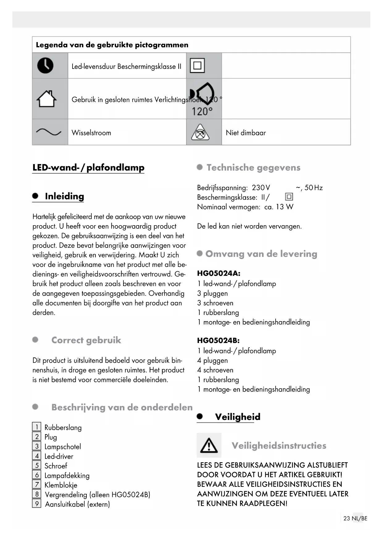 Neem de aanduiding van de verpak- kingsmaterialen voor de afvalscheiding in acht. Deze zijn gemarkeerd met de af- kortingen (a) en een cijfers (b) met de volgende betekenis: 1–7: kunststoffen / 20–22: papier en vezelplaten / 80–98: composietmaterialen. Het product en de verpakkingsmaterialen zijn recyclebaar; verwijder deze afzon- derlijk voor een betere afvalbehandeling. Het Triman-logo geldt alleen voor Frankrijk. Informatie over de mogelijkheden om het uitgediende product na gebruik te ver- wijderen, verstrekt uw gemeentelijke overheid. Gooi het afgedankte product omwille van het milieu niet weg via het huisvuil, maar geef het af bij het daarvoor bestemde depot of het gemeentelijke milieupark. Over afgifteplaatsen en hun openingstijden kunt u zich bij uw aangewezen instantie informeren. Garantie Het product wordt volgens strenge kwaliteitsrichtlijnen zorgvuldig geproduceerd en voor levering grondig getest. In geval van schade aan het product kunt u rechtmatig beroep doen op de verkoper van het product. Deze wettelijke rechten worden door onze hierna vermelde garantie niet beperkt. Op dit product verlenen wij 3 jaar garantie vanaf aankoopdatum. De garantieperiode start op de dag van aankoop. Bewaar de originele kassabon alstublieft. Dit document is nodig als bewijs voor aankoop. Wanneer binnen 3 jaar na de aankoopdatum van dit product een materiaal- of productiefout optreedt, dan wordt het product door ons – naar onze keuze – gratis voor u gerepareerd of vervangen. Deze garantie komt te vervallen als het product bescha- digd wordt, niet correct gebruikt of onderhouden wordt. De garantie geldt voor materiaal- en productiefouten. Deze garantie is niet van toepassing op producton- derdelen, die onderhevig zijn aan normale slijtage en hierdoor als aan slijtage onderhevige onderdelen gelden (bijv. batterijen) of voor beschadigingen aan breekbare onderdelen, zoals bijv. schakelaars, accu’s of dergelijke onderdelen, die gemaakt zijn van glas. Afwikkeling in geval van garantie Om een snelle afhandeling van uw reclamatie te waarborgen dient u de volgende instructies in acht te nemen:27 NL/BE Houd bij alle vragen alstublieft de kassabon en het artikelnummer (bijv. IAN 123456_7890) als bewijs van aankoop bij de hand. Het artikelnummer vindt u op de typeplaat, ingegra- veerd, op het titelblad van uw handleiding (linksonder) of als sticker op de achter- of onderzijde. Wanneer er storingen in de werking of andere gebreken optreden, dient u eerst telefonisch of per e-mail contact met de onderstaande service-afdeling op te nemen. Een als defect geregistreerd product kunt u dan samen met uw aankoopbewijs (kassabon) en ver- melding van de concrete schade alsmede het tijdstip van optreden voor u franco aan het u meegedeelde servicepunt verzenden. Service Service Nederland Tel.: 0900 0400 223 (0,10 EUR / Min.) E-Mail: owim@lidl.nl Service Belgiё Tel.: 070 270 171 (0,15 EUR / Min.) E-Mail: owim@lidl.be28 PL Legenda zastosowanych piktogramów .............................................................Strona 29 Wstęp ................................................................................................................................................Strona 29 Zastosowanie zgodne z przeznaczeniem .......................................................................................Strona 29 Opis części .........................................................................................................................................Strona 29 Dane techniczne ................................................................................................................................Strona 29 Zawartość ...........................................................................................................................................Strona 29 Bezpieczeństwo ........................................................................................................................Strona 30 Wskazówki bezpieczeństwa.............................................................................................................Strona 30 Przed uruchomieniem .........................................................................................................Strona 30 Montaż .............................................................................................................................................Strona 31 Włączanie / Wyłączanie produktu ...........................................................................Strona 31 Konserwacja i czyszczenie..............................................................................................Strona 32 Utylizacja .......................................................................................................................................Strona 32 Gwarancja ....................................................................................................................................Strona 32 Sposób postępowania w przypadku naprawy gwarancyjnej........................................................Strona 33 Serwis .................................................................................................................................................Strona 3329 PL Legenda zastosowanych piktogramów Żywotność diod LED Klasa ochrony II Użycie w zamkniętych pomieszczeniach Kąt świecenia 120 ° Prąd zmienny Bez możliwości ściemniania Ledowa lampa ścienna / sufitowa Wstęp Gratulujemy Państwu zakupu nowego produktu. Tym samym zdecydowali się Państwo na zakup produktu wysokiej jakości. Instrukcja obsługi jest częścią tego produktu. Zawiera ona ważne wskazówki dotyczące bezpieczeństwa, użytkowania iutylizacji. Przed pierwszym użyciem produktu należy zapoznać się ze wszystkimi wskazówkami dotyczącymi obsługi ibezpieczeństwa. Używać produktu wyłącznie zgodnie zjego poniżej opisanym przeznaczeniem. Wprzypadku przekazania produktu innej osobie należy dołączy