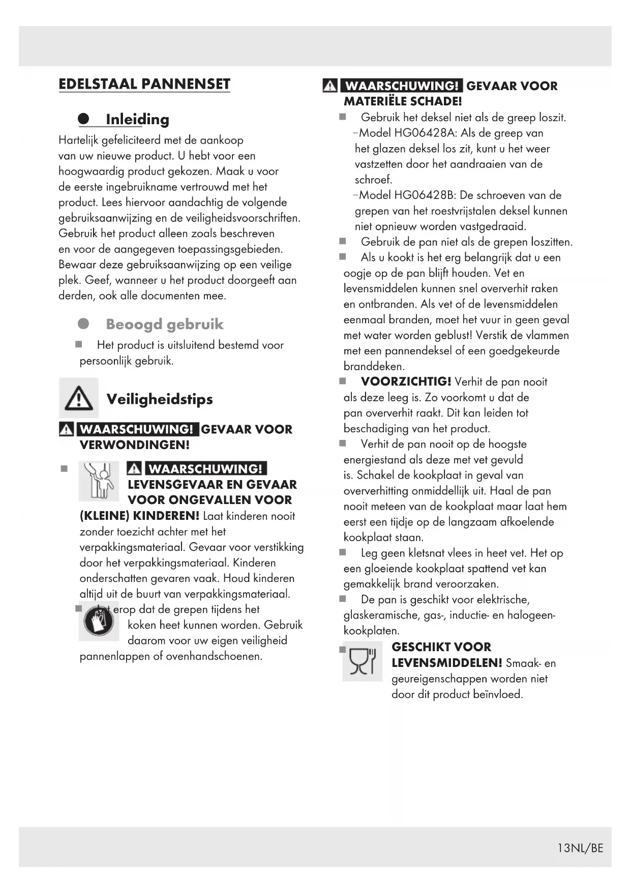 MATERIËLE SCHADE! Gebruik het deksel niet als de greep loszit. – Model HG06428A: Als de greep van het glazen deksel los zit, kunt u het weer vastzetten door het aandraaien van de schroef. – Model HG06428B: De schroeven van de grepen van het roestvrijstalen deksel kunnen niet opnieuw worden vastgedraaid. Gebruik de pan niet als de grepen loszitten. Als u kookt is het erg belangrijk dat u een oogje op de pan blijft houden. Vet en levensmiddelen kunnen snel oververhit raken en ontbranden. Als vet of de levensmiddelen eenmaal branden, moet het vuur in geen geval met water worden geblust! Verstik de vlammen met een pannendeksel of een goedgekeurde branddeken. VOORZICHTIG! Verhit de pan nooit als deze leeg is. Zo voorkomt u dat de pan oververhit raakt. Dit kan leiden tot beschadiging van het product. Verhit de pan nooit op de hoogste energiestand als deze met vet gevuld is. Schakel de kookplaat in geval van oververhitting onmiddellijk uit. Haal de pan nooit meteen van de kookplaat maar laat hem eerst een tijdje op de langzaam afkoelende kookplaat staan. Leg geen kletsnat vlees in heet vet. Het op een gloeiende kookplaat spattend vet kan gemakkelijk brand veroorzaken. De pan is geschikt voor elektrische, glaskeramische, gas-, inductie- en halogeen- kookplaten.