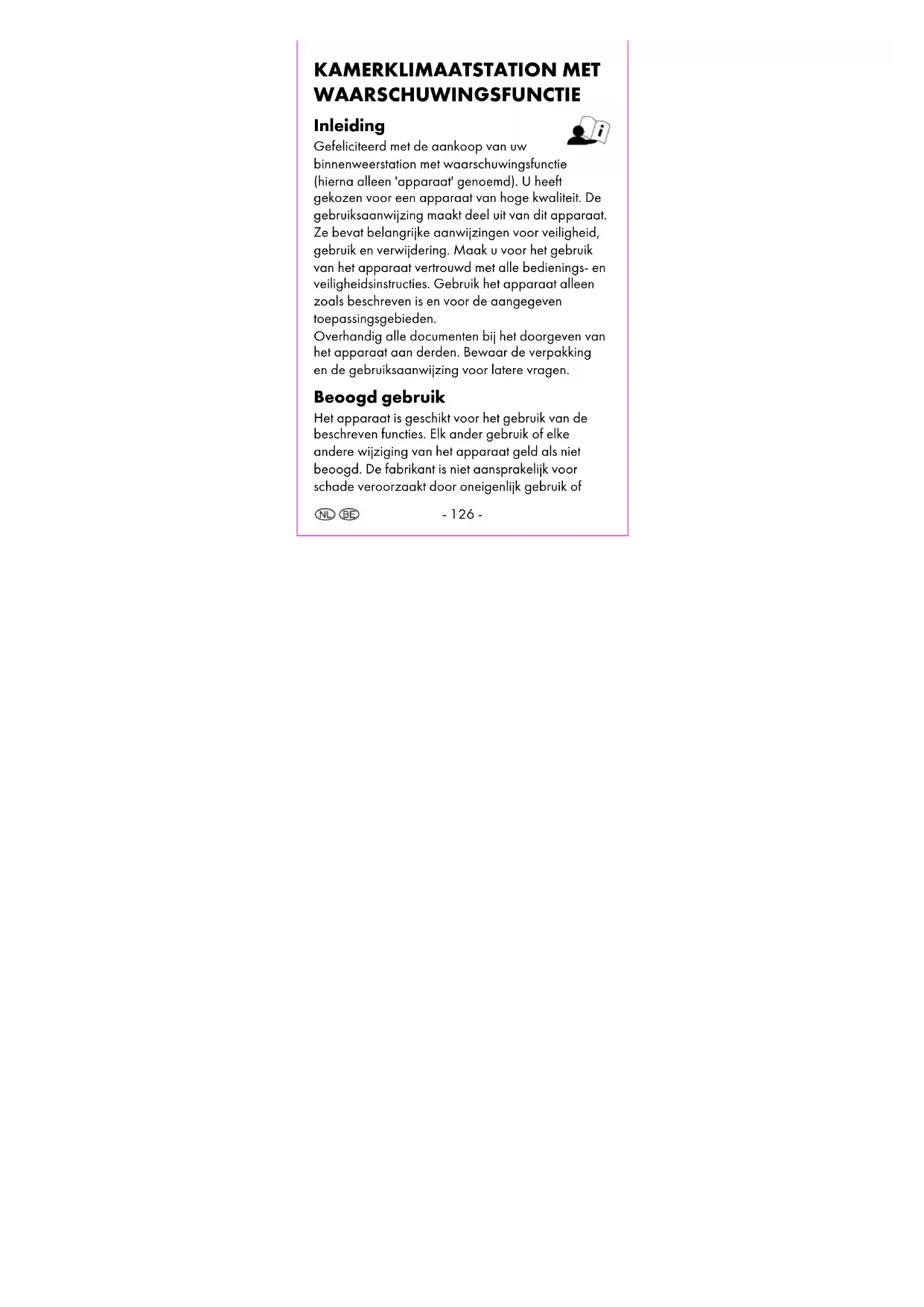 Dauwpunttemperatuur ................................- 140 - Luchtvochtigheidsgrenswaarden instellen .......- 143 - Luchtvochtigheidsalarm activeren of deactiveren ........................................................- 144 -- 125 - Comfortindex ...............................................- 144 - Kamertemperatuurweergave ...........................- 145 - Schimmelwaarschuwing instellen .....................- 146 - Griep- en hittefuncties .......................................- 147 - Griepwaarschuwingsweergave .......................- 147 - Hittewaarschuwingsweergave .........................- 148 - MAX.MIN-opname weergeven .......................- 148 - MAX.MIN-opname wissen ...............................- 149 - Batterijniveauweergave ....................................- 149 - Reinigingsinstructies ...........................................- 149 - Opslag ...............................................................- 150 - Vereenvoudigde EU-conformiteitsverklaring ..- 150 - Verwijdering ......................................................- 151 - Weggooien van het elektrische apparaat - 151 - Verwijderen van batterijen .........................- 154 - Recyclen .......................................................- 158 - Huisvuilafvoer ..............................................- 158 - Garantie van digi-tech gmbh ...........................- 159 - Garantievoorwaarden................................- 159 - Garantietermijn en wettelijke claims voor gebreken .............................................- 160 - Garantiedekking .........................................- 160 - Afhandeling van een garantiegeval ..........- 161 - Service ................................................................- 162 - Leverancier .........................................................- 164 -- 126 - KAMERKLIMAATSTATION MET WAARSCHUWINGSFUNCTIE Inleiding Gefeliciteerd met de aankoop van uw binnenweerstation met waarschuwingsfunctie (hierna alleen 'apparaat' genoemd). U heeft gekozen voor een apparaat van hoge kwaliteit. De gebruiksaanwijzing maakt deel uit van dit apparaat. Ze bevat belangrijke aanwijzingen voor veiligheid, gebruik en verwijdering. Maak u voor het gebruik van het apparaat vertrouwd met alle bedienings- en veiligheidsinstructies. Gebruik het apparaat alleen zoals beschreven is en voor de aangegeven toepassingsgebieden. Overhandig alle documenten bij het doorgeven van het apparaat aan derden. Bewaar de verpakking en de gebruiksaanwijzing voor latere vragen. Beoogd gebruik Het apparaat is geschikt voor het gebruik van de beschreven functies. Elk ander gebruik of elke andere wijziging van het apparaat geld als niet beoogd. De fabrikant is niet aansprakelijk voor schade veroorzaakt door oneigenlijk gebruik of- 127 - onjuist gebruik. Het apparaat is niet bedoeld voor commercieel gebruik. Inbegrepen in de levering Opmerking: controleer na de aankoop of alles aanwezig is. Zorg ervoor dat alle onderdelen aanwezig zijn en niet defect zijn. Als de levering onvolledig en/of onderdelen beschadigd zijn, gebruik het apparaat dan niet. Neem contact op met de serviceafdeling (zie "Beroep doen op garantie"). 1 x binnenweerstation 2 x batterijen 1,5 V AAA LR03 1 x gebruiksaanwijzing Technische gegevens Meetbereik/temperatuur: 0 °C - 50 °C Meetbereik/luchtvochtigheid: 20 % - 95 % Temperatuurweergave/tolerantie in het kernmeetbereik: +/- 1 °C Luchtvochtigheidsweergave/tolerantie in het kernmeetbereik: 41% - 80% - ±3%; overig meetbereik: ±5% Afmetingen: ca. 115 x 74 x 24 mm- 128 - Gewicht: model 1: ca. 97 g (excl. batterijen) model 2: ca. 93 g (excl. batterijen) Batterijen: 2 x 1,5 V AAA R03/LR03 - symbool voor gelijkspanning Tekenverklaring WAARSCHUWING! Dit signaalsymbool/-woord wijst op een gevaar met een gemiddeld risico, dat, wanneer het niet vermeden wordt, de dood of een ernstig letsel tot gevolg kan hebben. Opmerking: Dit signaalwoord wordt gebruikt voor aanvullende informatie.