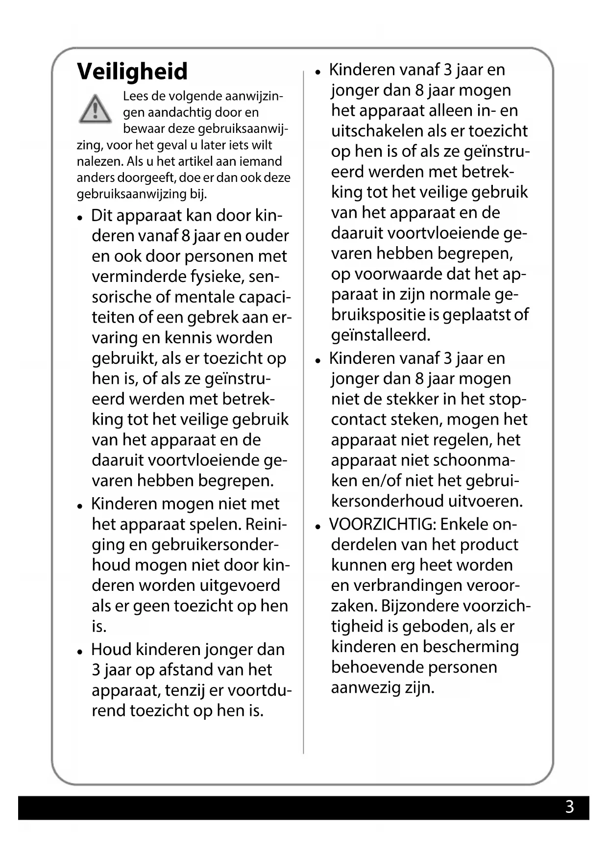- NL | Dit product is niet geschikt als hoofdverwarming. Dit product is alleen geschikt voorgoed geïsoleerde ruimtes of voor occasioneel gebruik.FR | Cet appareil n’est pas conçu pour être utilisé comme chauffage principal. Cet appareil est uniquement destiné à être utilisé dans des pièces bien isolées ou pour un usage occasionnel. DE | Dieses Produkt eignet sich nicht als Hauptheizgerät. Dieses Produkt ist nur für gut isolierte Räume oder für den gelegentlichen Gebrauch geeignet. Druckbuch Heizlüfter BEL.book Seite 1 Dienstag, 31. Juli 2018 11:00 112 Inhoud Veiligheid p. 3