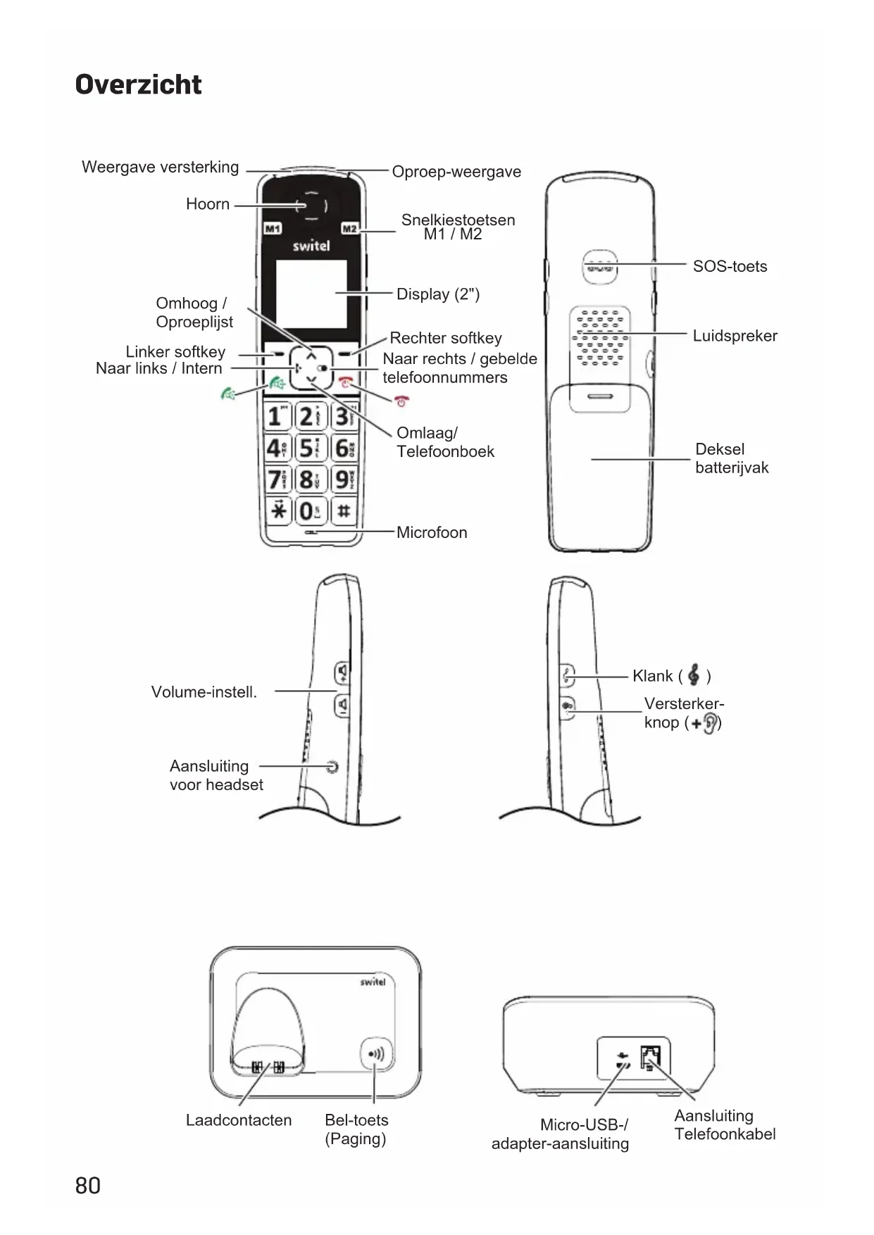 Installatie Inhoud 1 basisstation 1 handset 3 NiMH-batterijen 1,2 V/ 600 mAh 1 adapter 1 draagclip voor handset 1 telefoonkabel 1 gebruikshandleiding Basisstation aansluiten Batterijen plaatsen Handset laden Laat voordat u de telefoon voor het eerst gebruikt, de handset minstens 15 laden. Zet daartoe de handset in het laadstation. Draagclip Met de meegeleverde draagclip kunt u de handset bv. aan uw riem dragen. Netaansluiting Telefoonaansluiting NLHeadset De standaard headset-ingang van 3,5 mm bevindt zich op de linkerkant van de handset. Om de headset te gebruiken en handenvrij te bellen, steekt u de stekker van de headset in de ingang. Bediening Toetsenfuncties (handset)