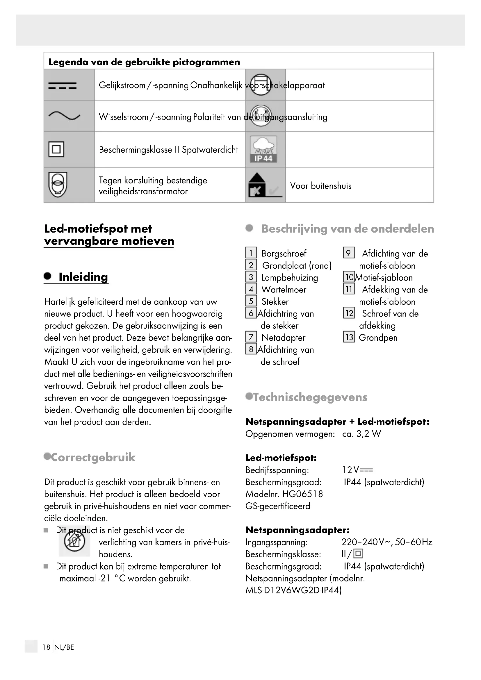 Maximale nominale temperatuur van de buitenkant voor de stroomvoorziening (tc): 75 °C SELV: Beveiligde extra lage spanning (Safety Extra Low Voltage) Omvang van de levering 1 Led-motiefspot met vervangbare motieven 1 netadapter 1 grondpen met schroef 1 grondplaat (rond) 6 motief-sjablonen 1 gebruiksaanwijzing Veiligheidsinstructies