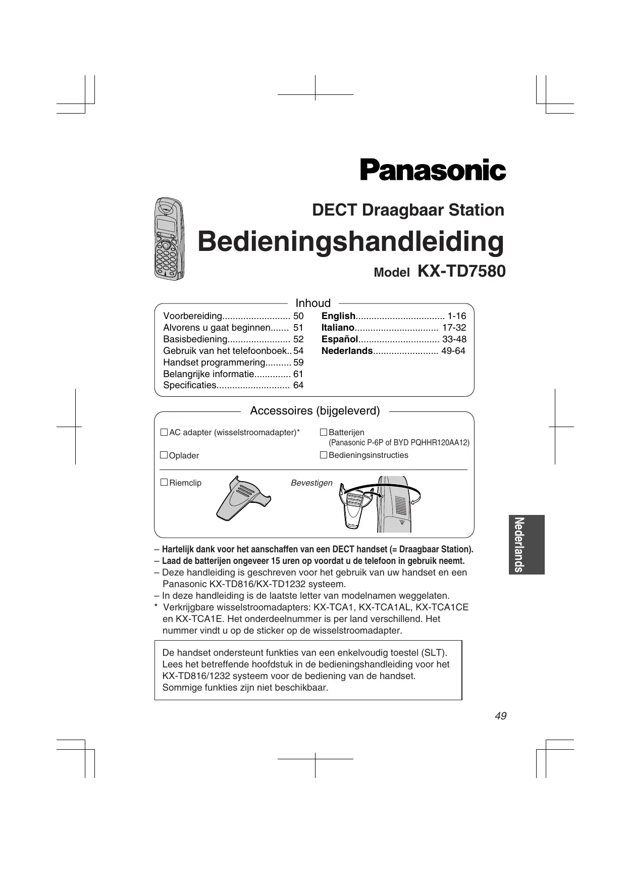 - Specificaties Accessoires (bijgeleverd) Batterijen (Panasonic P-6P of BYD PQHHR120AA12) Oplader Bedieningsinstructies Riemclip Español AC adapter (wisselstroomadapter)* Bevestigen Nederlands – Hartelijk dank voor het aanschaffen van een DECT handset (= Draagbaar Station). – Laad de batterijen ongeveer 15 uren op voordat u de telefoon in gebruik neemt. – Deze handleiding is geschreven voor het gebruik van uw handset en een Panasonic KX-TD816/KX-TD1232 systeem. – In deze handleiding is de laatste letter van modelnamen weggelaten. p. 64