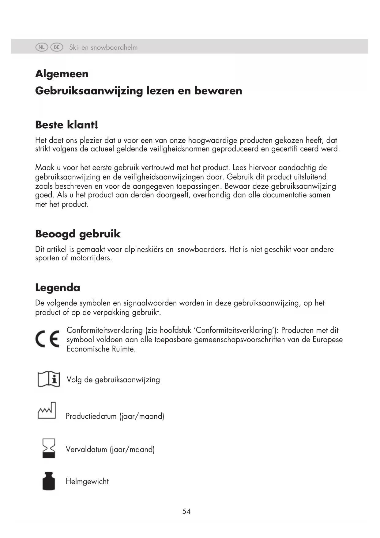 Algemeen Gebruiksaanwijzing lezen en bewaren Beste klant! Het doet ons plezier dat u voor een van onze hoogwaardige producten gekozen heeft, dat strikt volgens de actueel geldende veiligheidsnormen geproduceerd en gecerti ceerd werd. Maak u voor het eerste gebruik vertrouwd met het product. Lees hiervoor aandachtig de gebruiksaanwijzing en de veiligheidsaanwijzingen door. Gebruik dit product uitsluitend zoals beschreven en voor de aangegeven toepassingen. Bewaar deze gebruiksaanwijzing goed. Als u het product aan derden doorgeeft, overhandig dan alle documentatie samen met het product. Beoogd gebruik Dit artikel is gemaakt voor alpineskiërs en -snowboarders. Het is niet geschikt voor andere sporten of motorrijders. Legenda De volgende symbolen en signaalwoorden worden in deze gebruiksaanwijzing, op het product of op de verpakking gebruikt. Conformiteitsverklaring (zie hoofdstuk ‘Conformiteitsverklaring’): Producten met dit symbool voldoen aan alle toepasbare gemeenschapsvoorschriften van de Europese Economische Ruimte. Volg de gebruiksaanwijzing Productiedatum (jaar/maand) Vervaldatum (jaar/maand) HelmgewichtSki- en snowboardhelm