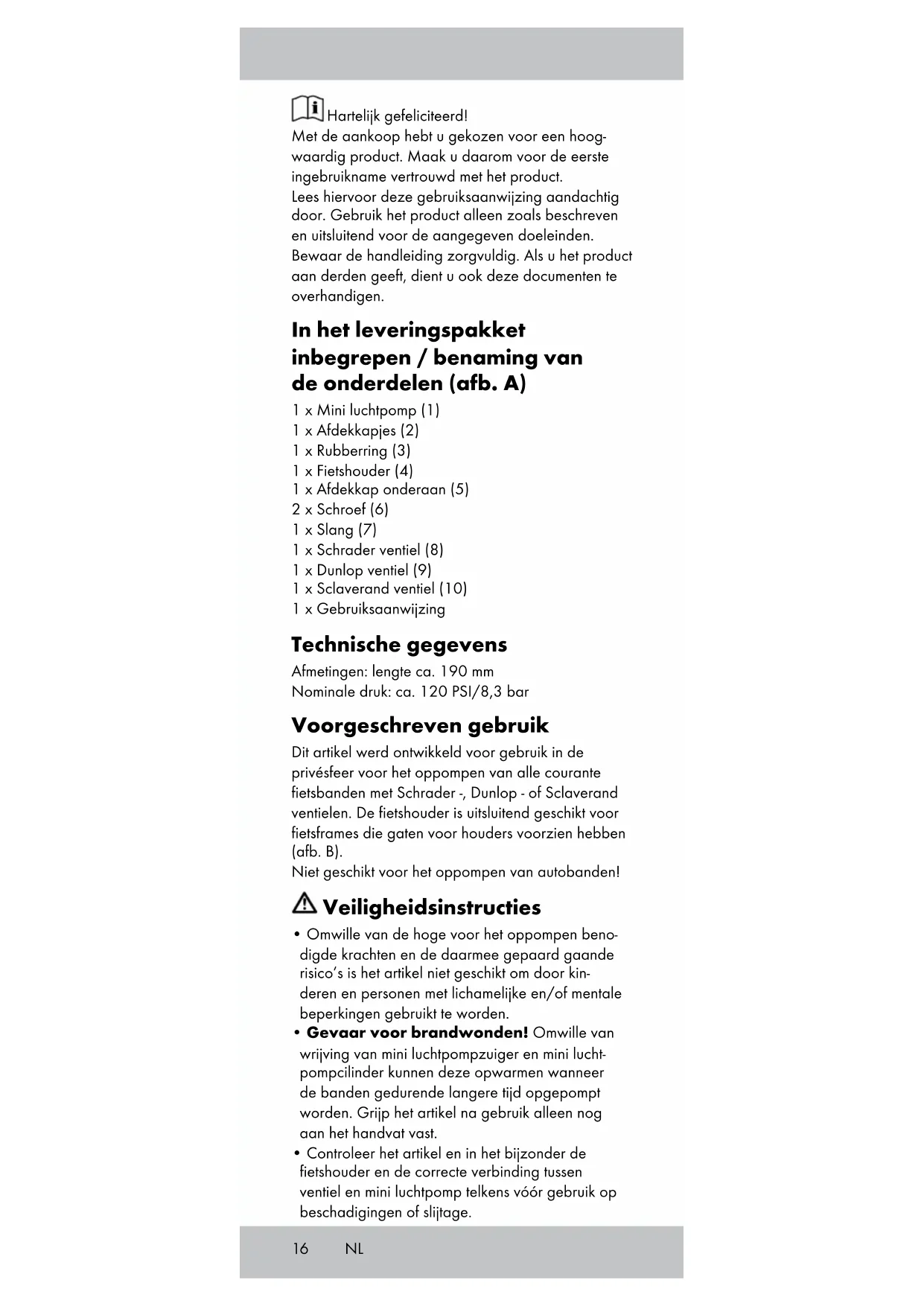 - Gevaar voor brandwonden! Omwille van wrijving van mini luchtpompzuiger en mini lucht- pompcilinder kunnen deze opwarmen wanneer de banden gedurende langere tijd opgepompt worden. Grijp het artikel na gebruik alleen nog aan het handvat vast.