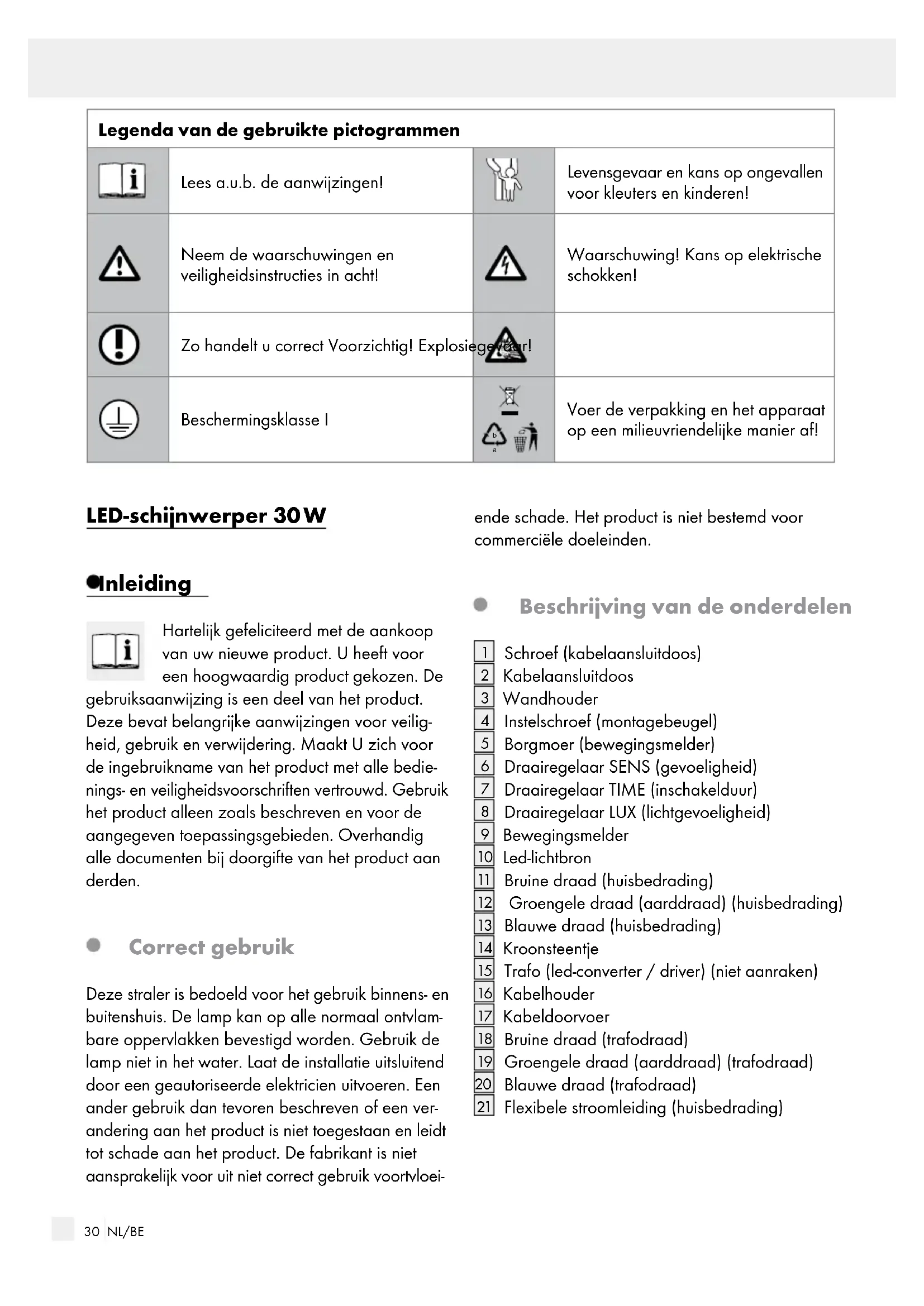 Deze straler is bedoeld voor het gebruik binnens- en buitenshuis. De lamp kan op alle normalaal ontvlambare oppervlakken bevestigd worden. Gebruik de lamp Niet in het water. Laat de installmentie uitsluitend door een geauthoriseerde elektricien uitvoeren. Een ander gebruik dan tevoren beschreiben of een verondering aan het product is Niet toegestaan en leidt tot schade aan het product. De fabrikant is Niet aansprakelijk voor uit Niet correct gebruik voortvloei