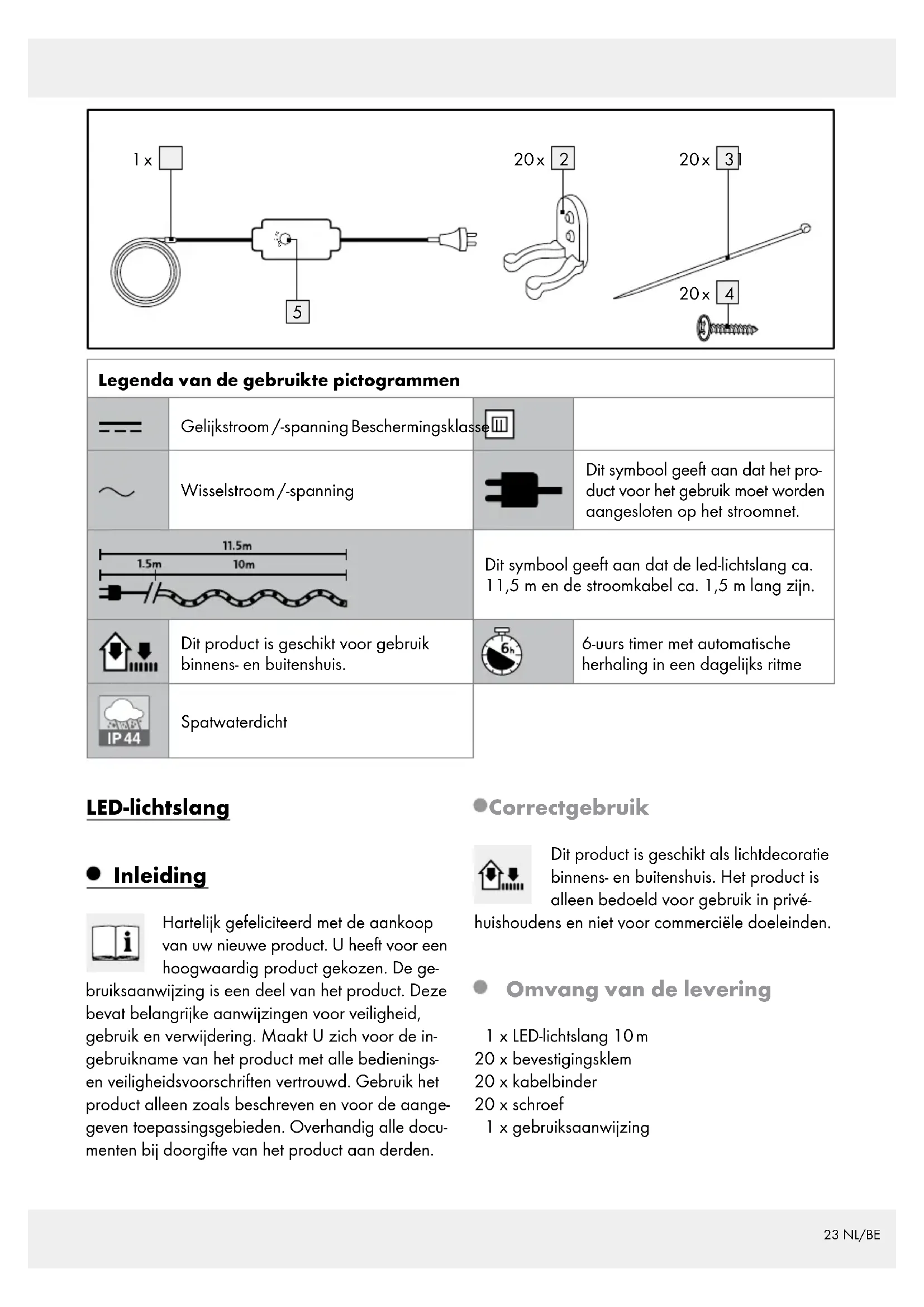is spatwaterdicht (IP44). Deze beschermingsgraad blijft alleen behouden als het gebruikte stopcontact minimaal voldoet aan deze beschermingsgraad. Zorg ervoor dat de LED-lichtslang