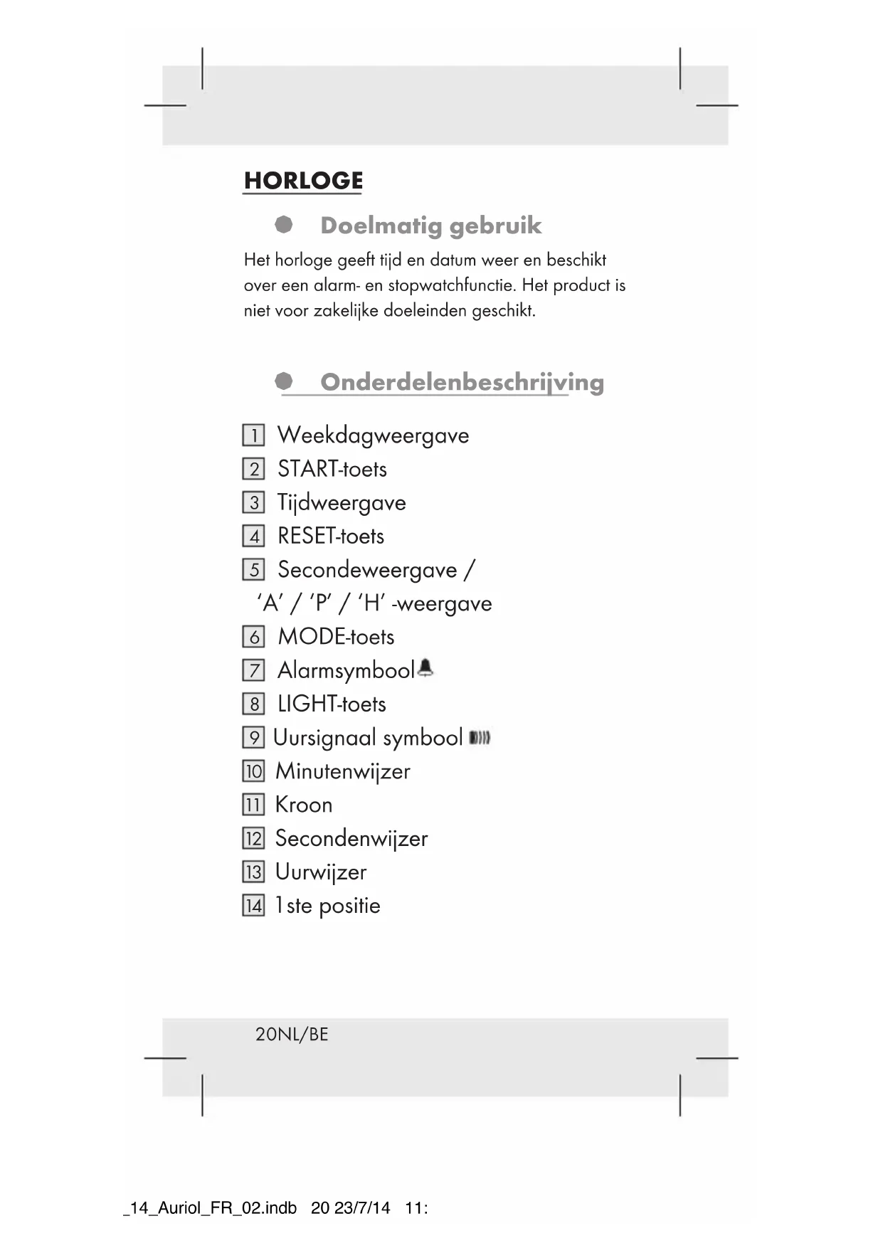 Milieuschade door verkeerde afvoer van batterijen! Batterijen mogen niet via het huisafval worden afgevoerd. Ze kunnen giftig zwaar metaal bevatten en moeten worden behandeld als gevaarlijk afval. De chemische symbolen van de zware metalen zijn als volgt: Cd = cadmium, Hg = kwikzilver, Pb = lood. Geef verbruikte batterijen daarom af bij een gemeentelijk inzamelpunt. § GARANTIE Het apparaat wordt volgens strenge kwaliteitsrichtlijnen zorgvuldig geproduceerd en voor levering grondig getest. In geval van schade aan het product kunt u rechtmatig beroep doen op de verkoper van het product. Deze wettelijke rechten worden door onze hierna vermelde garantie niet beperkt. U ontvangt op dit apparaat 3 jaar garantie vanaf de aankoopdatum. De garantieperiode start op de dag van aankoop. Bewaar de originele kassabon alstublieft. Dit document is nodig als bewijs voor aankoop. 101166_14_Auriol_FR_02.indb 32 23/7/14 11:45 am33NL/BE Wanneer binnen drie jaar na de aankoopdatum van dit product een materiaal- of productiefout optreedt, dan wordt het product door ons – naar onze keuze – gratis voor u gerepareerd of vervangen. Deze garantie komt te vervallen als het product beschadigd wordt, niet correct gebruikt of onderhouden wordt. De garantie geldt voor materiaal- en productiefouten. Deze garantie is niet van toepassing op productonderdelen, die onderhevig zijn aan normale slijtage en hierdoor als aan slijtage onderhevige onderdelen gelden (bijv. batterijen) of voor beschadigingen aan breekbare onderdelen, zoals bijv. schakelaars, accu’s of dergelijke onderdelen, die gemaakt zijn van glas. Het verminderen van de waterdichtheid valt eveneens niet onder de garantie. De toestand van de waterdichtheid is geen voortdurende eigenschap en dient daarom regelmatig onderhouden te worden. Houd er alstublieft rekening mee, dat door het openen en repareren van uw horloge door personen, die hiertoe niet gemachtigd zijn, uw garantie komt te vervallen. 101166_14_Auriol_FR_02.indb 33 23/7/14 11:45 am34 DE/AT/CH ARMBANDUHR § Bestimmungsgemäße Verwendung Die Armbanduhr zeigt Uhrzeit und Datum an und verfügt über eine Wecker- und Stoppuhrfunktion Das Gerät ist nicht für den gewerblichen Einsatz vorgesehen. § Bezeichnung der Teile