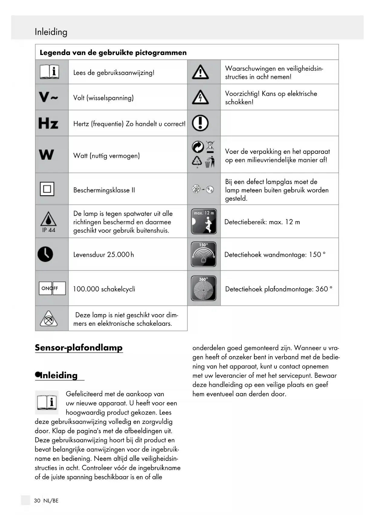 Voer de verpakking en het apparaat op een milieuvriendelijke manier af! Beschermingsklasse II Bij een defect lampglas moet de lamp meteen buiten gebruik worden gesteld. IP 44 De lamp is tegen spatwater uit alle richtingen beschermd en daarmee geschikt voor gebruik buitenshuis. max. 12 m Detectiebereik: max. 12 m Levensduur 25.000 h