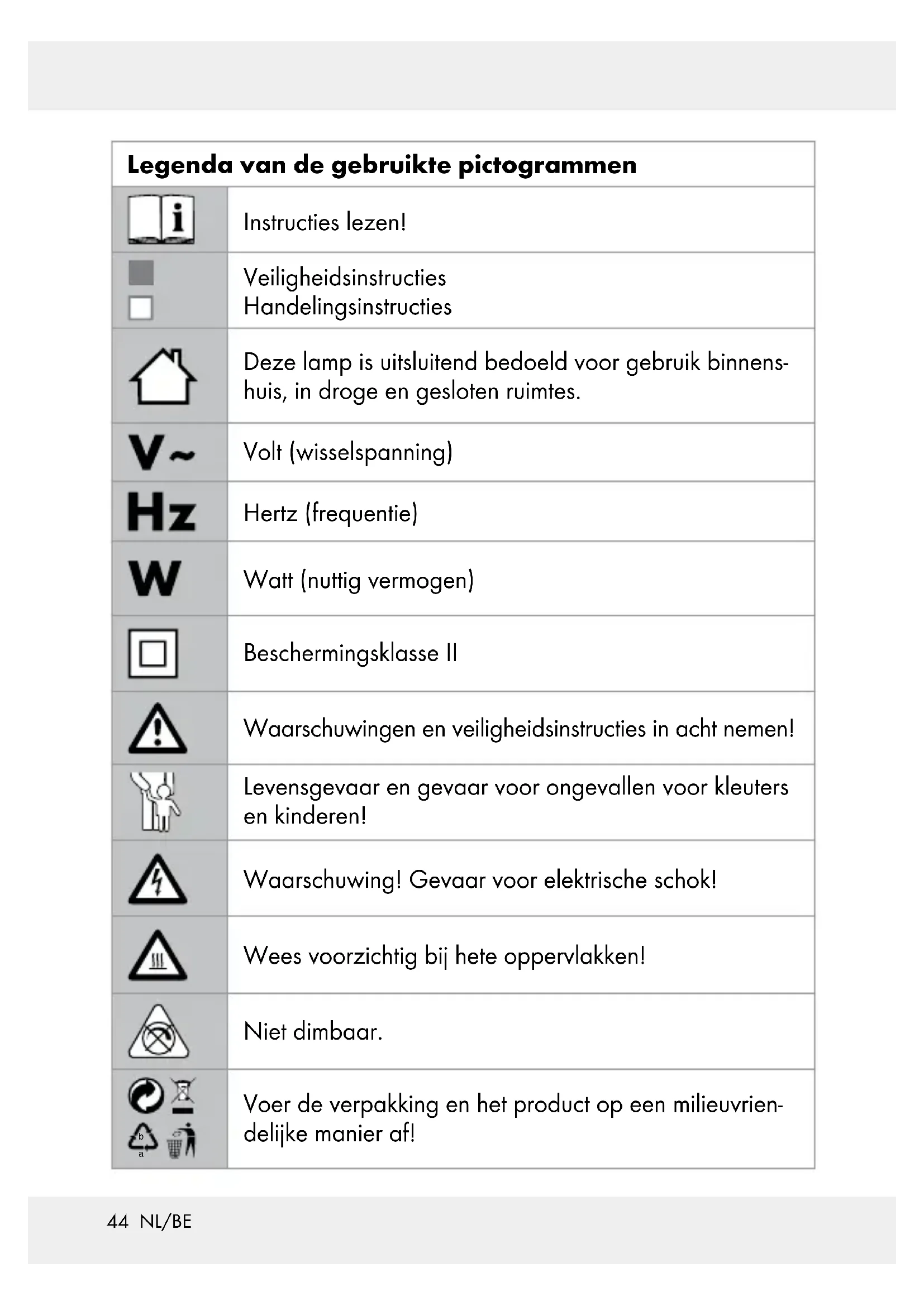 Borgmoer Technische gegevens Artikelnummer: 54687 / 54688 / 54693 / 54694 Bedrijfsspanning: 220–240 V∼ 50 / 60 Hz Verlichtingsmiddel: LED, E14, 4 W Nominaal vermogen max.: 11 W Beschermingsklasse: II / Afmetingen: hoogte bij 90° arm 29,5 cm, lengte bo- venste arm 18,5 cm, lengte onderste arm 22,5 cm, Ø ca. 15,5 cm, lampenkop Ø 12,5 cm, lengte 15,5 cm Stroomkabel: lengte 160 cm Artikelnummer: 54689 / 54691 / 54695 / 54696 Bedrijfsspanning: 220–240 V∼ 50 / 60 Hz Verlichtingsmiddel: LED, E27, 4 W Nominaal vermogen max.: 40 W Beschermingsklasse: II /47 NL/BE Afmetingen: hoogte max. ca. 23 cm, Ø ca. 15,5 cm lampenvoet 12 cm x 1,9 cm Stroomkabel: lengte 160 cm Distributeur: Edi Light GmbH, Heiligkreuz 22, A-6136 Pill, www.edi-light.com Veiligheid Veiligheidsinstructies Bij schade die ontstaat door het negeren van deze gebruiksaanwijzing komt de garantieverlening te vervallen! Wij zijn niet aansprakelijk voor gevolgschade! Wij zijn niet aansprakelijk in geval van materiële schade of persoonlijk letsel als gevolg van ondeskundig gebruik of het negeren van de veiligheidsinstructies! LEVENSGEVAAR EN KANS OP ONGEVALLEN BIJ KLEUTERS EN KIN- DEREN! Dit product kan door kinderen vanaf 8 alsook personen met verminderde fysieke, sensorische of mentale vaardig- heden of een gebrek aan ervaring en kennis worden gebruikt, als zij onder toezicht staan of geïnstrueerd werden met betrekking tot het veilige gebruik van het product en de hieruit voortvloeiende gevaren begrijpen. Kinderen mogen niet met het product spelen. Reiniging en onderhoud mogen niet door kinderen zonder toezicht worden uitgevoerd. Laat de lamp of het verpakkingsmateriaal niet achteloos rond slinge- ren. Plastic folie / -zakken, kunststof delen etc. kunnen voor kinderen een gevaarlijk speelgoed zijn.48 NL/BE Vermijd levensgevaar door een elektrische schok Wij zijn niet aansprakelijk in geval van materiële schade of per- soonlijk letsel als gevolg van ondeskundig gebruik of het negeren van de veiligheidsinstructies! Gebruik de lamp niet als u een beschadiging heeft geconstateerd. Controleer voor het aansluiten op het stroomnet de lamp en de stroomkabel met stekker op eventuele beschadigingen.