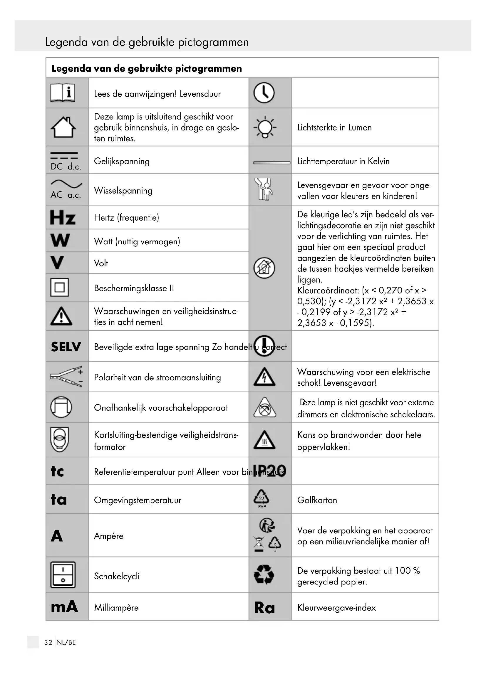 50 Hz Nominaal vermogen: max. 7 W Beschermingsklasse: II / Beschermingsgraad: IP20 Led-module: Vermogen: max. 5,8 W Zigbee: Versie: 3.0 Compatibel: iOS 9.0 / Android 5.0 Frequentie: 2,4 GHz ISM band Max. zendvermogen: <+ 10 dBm34 NL/BE Veiligheid Veiligheid Veiligheidsinstructies Bij beschadigingen die worden veroorzaakt door het niet in acht nemen van deze gebruiksaanwijzing vervalt de garantie! Wij zijn niet aansprakelijk voor gevolgschade! Bij materiële schade of persoonlijk letsel die worden veroorzaakt door onjuist gebruik of het niet in acht nemen van de veiligheidsinstructies zijn wij niet aansprakelijk! LE-