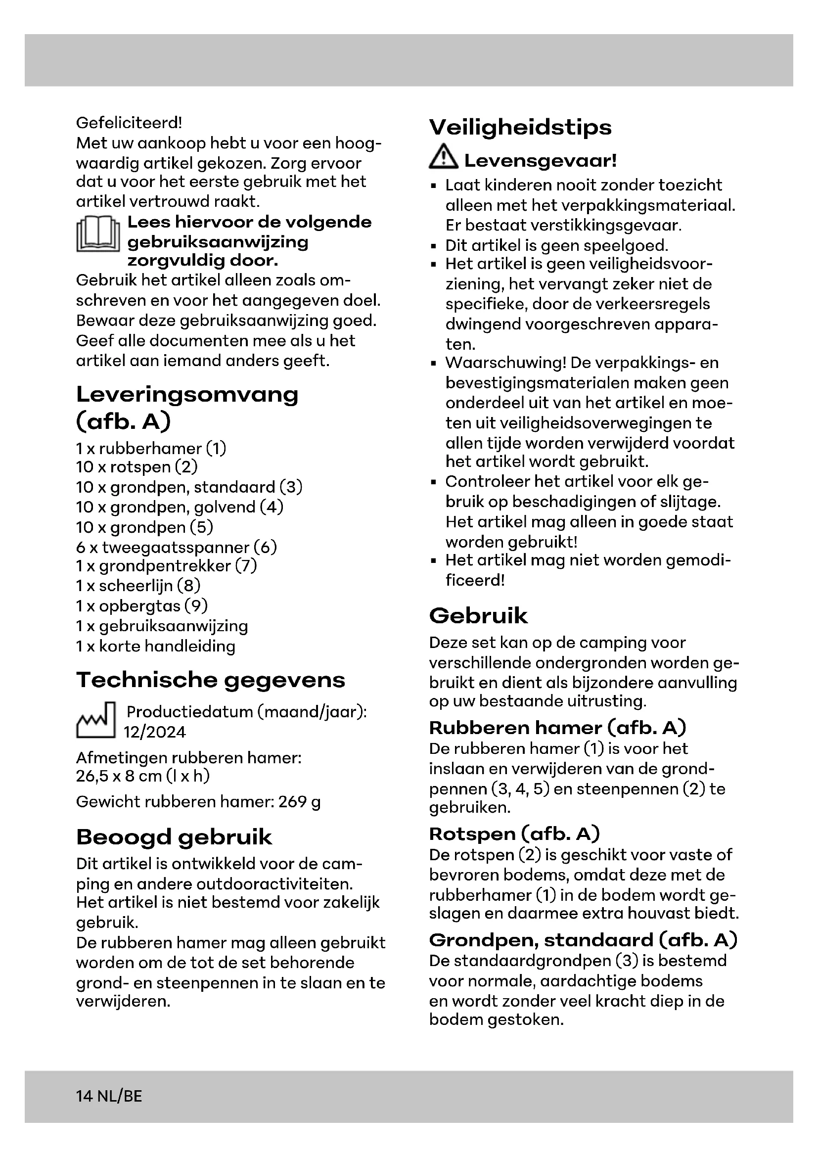 - Het artikel mag niet worden gemodi- ficeerd! Gebruik Deze set kan op de camping voor verschillende ondergronden worden ge- bruikt en dient als bijzondere aanvulling op uw bestaande uitrusting. Rubberen hamer (afb. A) De rubberen hamer (1) is voor het inslaan en verwijderen van de grond- pennen (3, 4, 5) en steenpennen (2) te gebruiken. Rotspen (afb.A) De rotspen (2) is geschikt voor vaste of bevroren bodems, omdat deze met de rubberhamer (1) in de bodem wordt ge- slagen en daarmee extra houvast biedt. Grondpen, standaard (afb.A) De standaardgrondpen (3) is bestemd voor normale, aardachtige bodems en wordt zonder veel kracht diep in de bodem gestoken.15NL/BE Grondpen, golvend (afb.A) De golvende grondpen (4) is door zijn lengte zeer geschikt voor een losse ondergrond. Grondpen (afb.A) Deze korte grondpen (5) is bestemd voor zanderige bodems die opvallen door een hoge dichtheid. 2-gats spanner en spanlijn (afb. A) Om de spanlijn (8) te gebruiken, steekt u deze zoals in afb. B getoond in de 2-gats spanner (6), knoopt u een uit- einde vast en gebruikt u de tot stand gekomen lus om de spanlijn op de grond te fixeren. Opslag, reiniging Laat alle onderdelen grondig drogen voordat u het artikel weer inpakt. Hier- door worden schimmelvorming, roest- vorming, geur en verkleuringen voorko- men. Bewaar het artikel wanneer u dit niet gebruikt altijd droog en schoon op kamertemperatuur. Bij onjuiste opslag van het artikel bestaat een kans op schimmel- en roestvorming. Reinig het artikel alleen met een vochtige schoon- maakdoek en droog het vervolgens af. BELANGRIJK! Reinig nooit met agressie- ve reinigingsmiddelen. Afvalverwerking Voer het artikel en de verpak- kingsmaterialen af in overeen- stemming met de actuele lokale voorschriften. Berg verpakkings- materialen (zoals bv. foliezakjes) op buiten het bereik van kinderen. Bijko- mende informatie over de afvoer van het onbruikbaar geworden artikel krijgt u bij uw gemeente- of stadsbestuur. Voer het artikel en de verpakking milieuvriendelijk af. De recyclingcode dient om verschillende materialen voor recyclingdoeleinden te kenmer- ken. De code bestaat uit een recy- clingsymbool voor de recyclingcyclus en een nummer dat het materiaal ken- merkt. Opmerkingen over garantie en serviceafhandeling Het artikel werd met de grootste zorgvuldigheid en onder permanent toezicht geproduceerd. De firma DELTA-SPORT HANDELSKONTOR GmbH verleent particuliere eindklanten op dit artikel drie jaar garantie, te rekenen vanaf de datum van aankoop (ga- rantietermijn) en dit op grond van de volgende bepalingen. De garantie geldt alleen voor materiaal- en verwerkings- fouten. De garantie is niet van toepas- sing op onderdelen die aan een normale slijtage onderhevig zijn en daarom als slijtageonderdelen te beschouwen zijn (bv. batterijen) en evenmin op breek- bare onderdelen zoals schakelaars of onderdelen die van glas gemaakt zijn. Uit de garantie voortvloeiende claims zijn uitgesloten als het artikel onvak- kundig, verkeerd of niet in het kader van de voorziene bepaling of in het kader van het voorziene gebruiksdoel- einde gebruikt werd of indien richtlijnen in de gebruiksaanwijzing niet in acht genomen werden, tenzij de eindklant aantoont dat er sprake is van een ma- teriaal- of verwerkingsfout die niet op één van de hoger vermelde omstandig- heden gebaseerd is.16 NL/BE Uit de garantie voortvloeiende claims kunnen alleen tijdens de garantieperio- de op vertoon van de originele kassa- bon ingediend worden. Gelieve daarom de originele kassabon te bewaren. De garantieperiode wordt door eventuele reparaties op grond van de garantie, wettelijke waarborg of coulance niet verlengd. Dit geldt ook voor vervangen en gerepareerde onderdelen. Gelieve u bij klachten in eerste instantie tot de hieronder vermelde servicehot- line te richten of met ons per e-mail contact op te nemen. Is er sprake van een garantiegeval, dan wordt het arti- kel door ons – naar onze keuze – voor u gratis gerepareerd, wordt het vervan- gen of wordt de aankoopsom terugbe- taald. Verdere rechten op grond van de garantie bestaan niet. Uw wettelijke rechten, in het bijzonder rechten op garantie tegenover de be- treffende verkoper, worden door deze garantie niet beperkt. IAN: 470672_2407 Service België Tel.: 0800 12089 E-Mail: deltasport@lidl.be Service Nederland Tel.: 0800 0249630 E-Mail: deltasport@lidl.nl17PL Gratulujemy! Decydując się naten produkt, otrzymu- ją Państwo towar wysokiej jakości. Nale- ży zapoznać się zproduktem przedjego pierwszym użyciem. Należy uważnie przeczytać następującą instrukcję użytkowania. Produkt ten należy użytkować wyłącznie wopisany sposób orazzgodnie zewska- zanym przeznaczeniem. Niniejszą in- strukcję użytkowania należy przechowy- wać wbezpiecznym miejscu. Przekazując produkt innej osobie, należy upewnić się, żeotrzyma onatakże całą dokumenta- cję dotyczącą produktu. Zakres dostawy (rys.A) 1xgumowy młotek (1) 10xśledź dopodłoża skalistego (2) 10xszpilka standardowa (3) 10xśledź falisty (4) 10xśledź(5) 6xnaciąg dwuotworowy (6) 1xwyciągacz dośledzi namiotowych (7) 1xlinka naciągowa (8) 1xtorba doprzechowywania (9) 1xinstrukcja użytkowania 1 x krótka instrukcja Dane techniczne Data produkcji (miesiąc/rok): 12/2024 Wymiary gumowego młotka: 26,5x8 cm (dł. x wys.) Masa gumowego młotka: 269 g Użytkowanie zgodne zprzeznaczeniem Produkt został zaprojektowany doużyt- ku nakempingach oraz podczas innych aktywności napowietrzu. Produkt ten niejest przeznaczony doużytku komercyjnego. Gumowego młotka należy używać tylko do wbijania i wyjmowania znajdujących się w zestawie szpilek do ziemi i do twardych podłoży. Wskazówki bezpieczeństwa Zagrożenie życia!