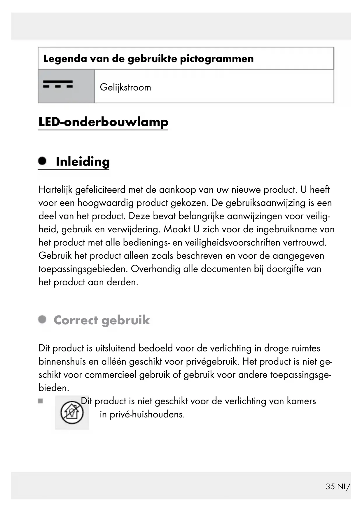 WAREN! Controleer het product voor ingebruikname op beschadigingen. Neem een beschadigd product niet in gebruik. Dit product kan door kinderen vanaf 8 alsmede door personen met verminderde fysieke, sensorische of mentale vaardigheden of een gebrek aan ervaring en kennis worden gebruikt, als zij onder toe- zicht staan of geïnstrueerd werden met betrekking tot het veilige ge- bruik van het product en zij de hieruit voortvloeiende gevaren begrijpen. Kinderen mogen niet met het product spelen. Reiniging en onderhoud mogen niet door kinderen zonder toezicht worden uitgevoerd. Gebruik het product nooit wanneer u enige beschadiging heeft ge- constateerd. De led‘s kunnen niet worden vervangen. Mochten de led‘s aan het einde van hun levensduur uitvallen, dient het gehele product te worden vervangen. Het product is uitsluitend bedoeld voor gebruik binnens- huis, in droge en gesloten ruimtes. Veiligheidsinstructies voor batterijen / accu‘s LEVENSGEVAAR! Houd batterijen / accu‘s buiten het bereik van kinderen. Raadpleeg bij inslikken onmiddellijk een arts!38 NL/BE EXPLOSIEGEVAAR! Laad niet oplaadbare batterijen nooit op. Sluit de batterijen / accu‘s niet kort en / of open deze niet. Daardoor kan de batterij oververhit raken, in brand vliegen of exploderen. Gooi batterijen / accu‘s nooit in het vuur of water. Stel batterijen / accu‘s nooit bloot aan mechanische belastingen. Risico dat de batterijen / accu’s lekken Vermijd extreme omstandigheden en temperaturen die invloed op de bat- terijen / accu‘s zouden kunnen hebben bijv. radiatoren / direct zonlicht. Vermijd contact met huid, ogen en slijmvliezen! Spoel in geval van contact met batterijzuur de desbetreffende plekken direct af met vol- doende schoon water en raadpleeg onmiddellijk een arts! DRAAG VEILIGHEIDSHANDSCHOENEN! Lekkende of beschadigde batterijen / accu‘s kunnen in geval van huidcontact chemische brandwonden veroor- zaken. Draag daarom in dit geval geschikte veiligheidshandschoenen. Als de batterijen / accu‘s lekken, dient u deze direct uit het product te halen om beschadigingen te vermijden. Gebruik alleen batterijen / accu‘s van hetzelfde type. Gebruik nooit nieuwe en oude batterijen / accu‘s door elkaar! Verwijder de batterijen / accu‘s, als u het product gedurende een langere periode niet gebruikt. Risico op beschadiging van het product Gebruik uitsluitend het aangegeven type batterij / accu! Plaats de batterijen / accu‘s volgens de weergegeven polariteit (+) en (-) op batterij / accu en op product. Reinig de contacten van de batterij / accu en die in het batterijvak, voordat u deze plaatst! Verwijder verbruikte batterijen / accu‘s direct uit het product.39 NL/BE Gebruik Opmerking: verwijder al het verpakkingsmateriaal van het product. Montage Bevestig de montageplaat
