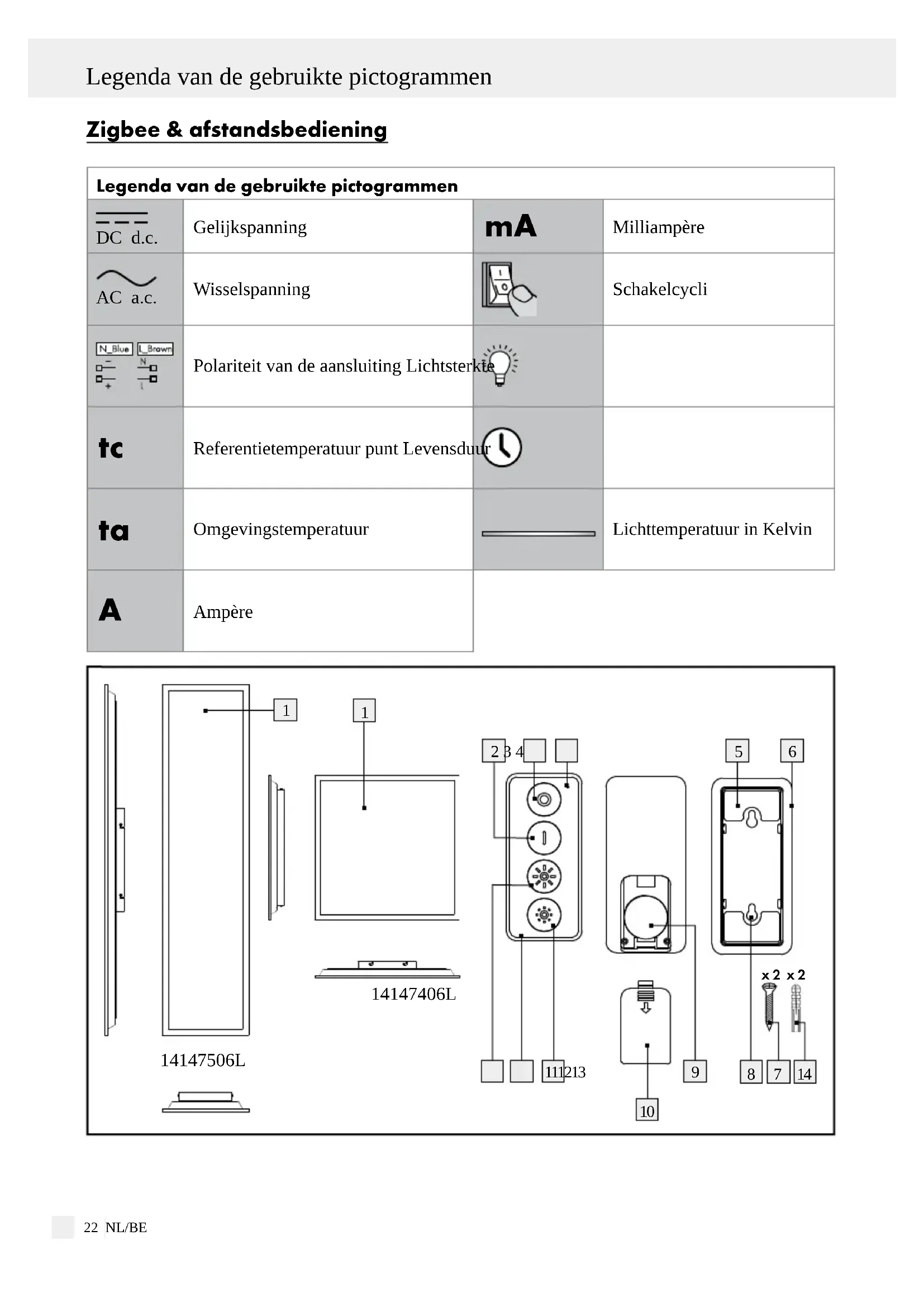 14147406L 14147506L 1423 NL/BE Legenda van de gebruikte pictogrammen Beschrijving ... / Technische gegevens / Lamp resetten / Afstandsbediening ... Beschrijving van de onderdelen