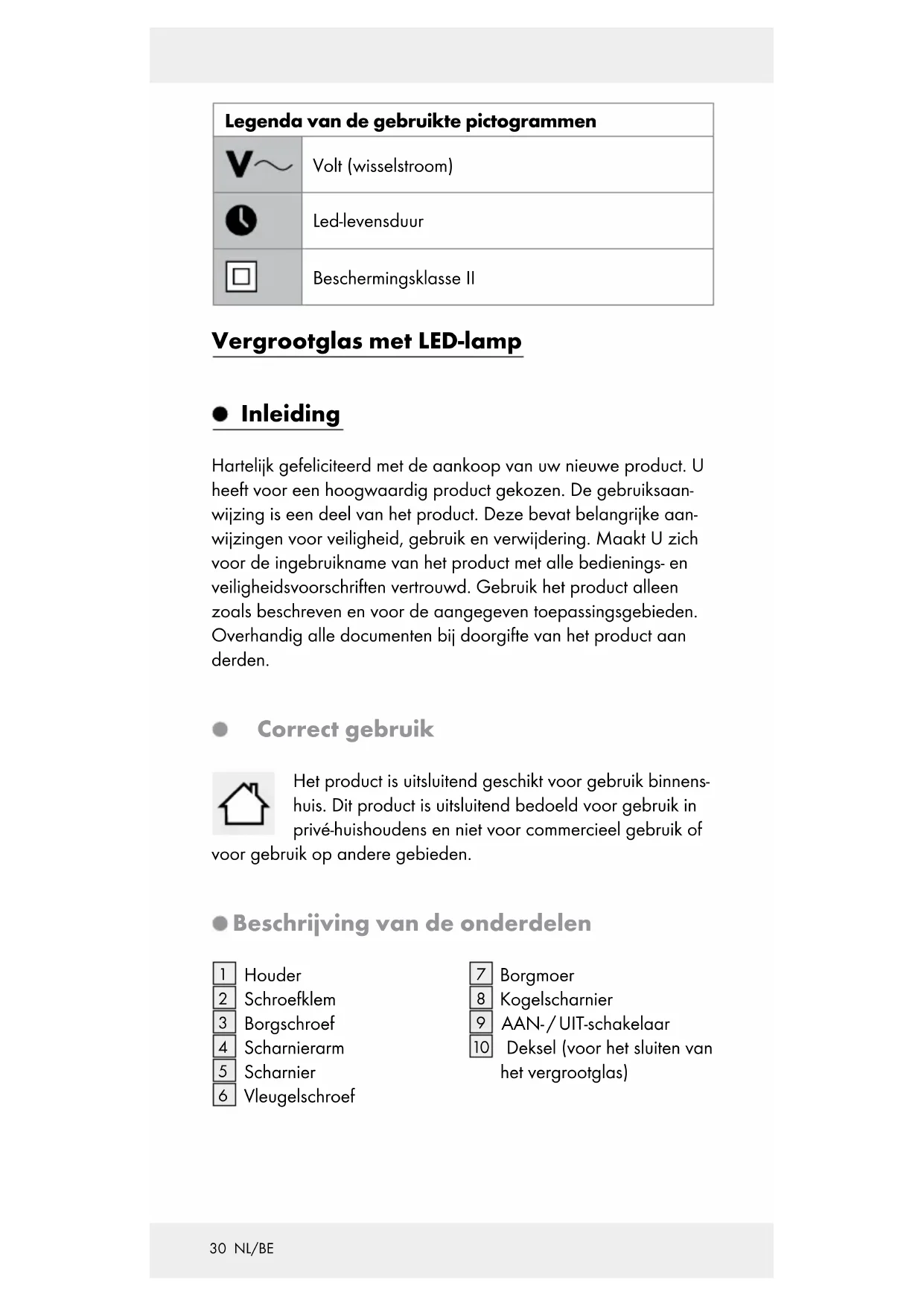Deksel (voor het sluiten van het vergrootglas)31 NL/BE Technische gegevens LED-lamp met vergrootglas Voedingsspanning: 230 V∼ (wisselstroom), 50 Hz Opgenomen vermogen: ca. 6,3 W Beschermingsklasse: II / TÜV SÜD- / GS- gecertificeerd Vergrootglas Lensformaat: ca. 5 dioptrie Vergroting: ca. 2,25-voudig Omvang van de levering 1 LED-lamp met vergrootglas 1 borgschroef 1 vleugelschroef 1 houder 1 schroefklem 1 bedieningshandleiding Veiligheid Veiligheidsinstructies