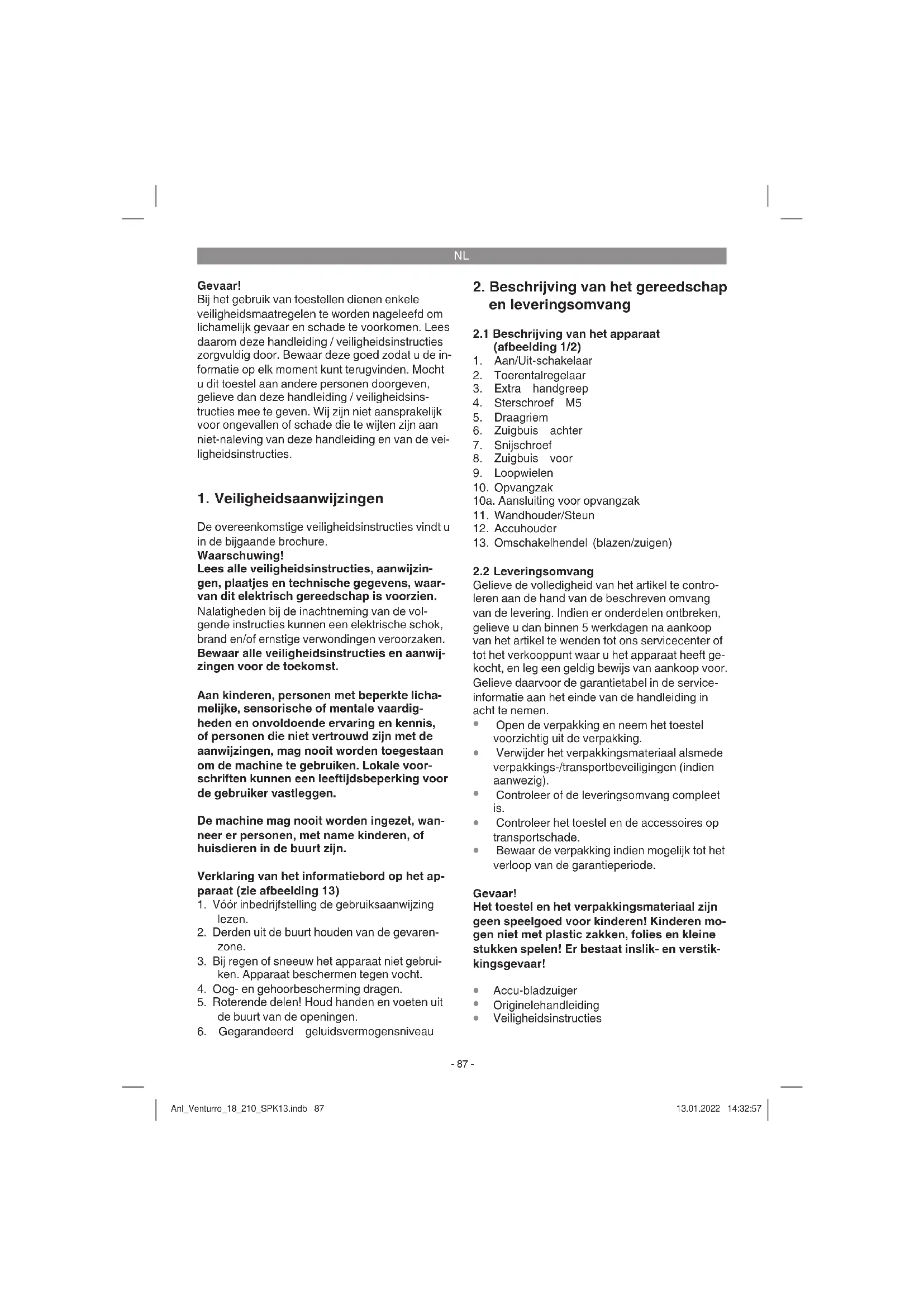 Voorzichtig! Onderzoek vóór inzet van het ap- paraat het vlak op verborgen objecten (bijv. kleine dieren en harde vreemde voorwerpen). Anl_Venturro_18_210_SPK13.indb 90Anl_Venturro_18_210_SPK13.indb 90 13.01.2022 14:32:5713.01.2022 14:32:57NL