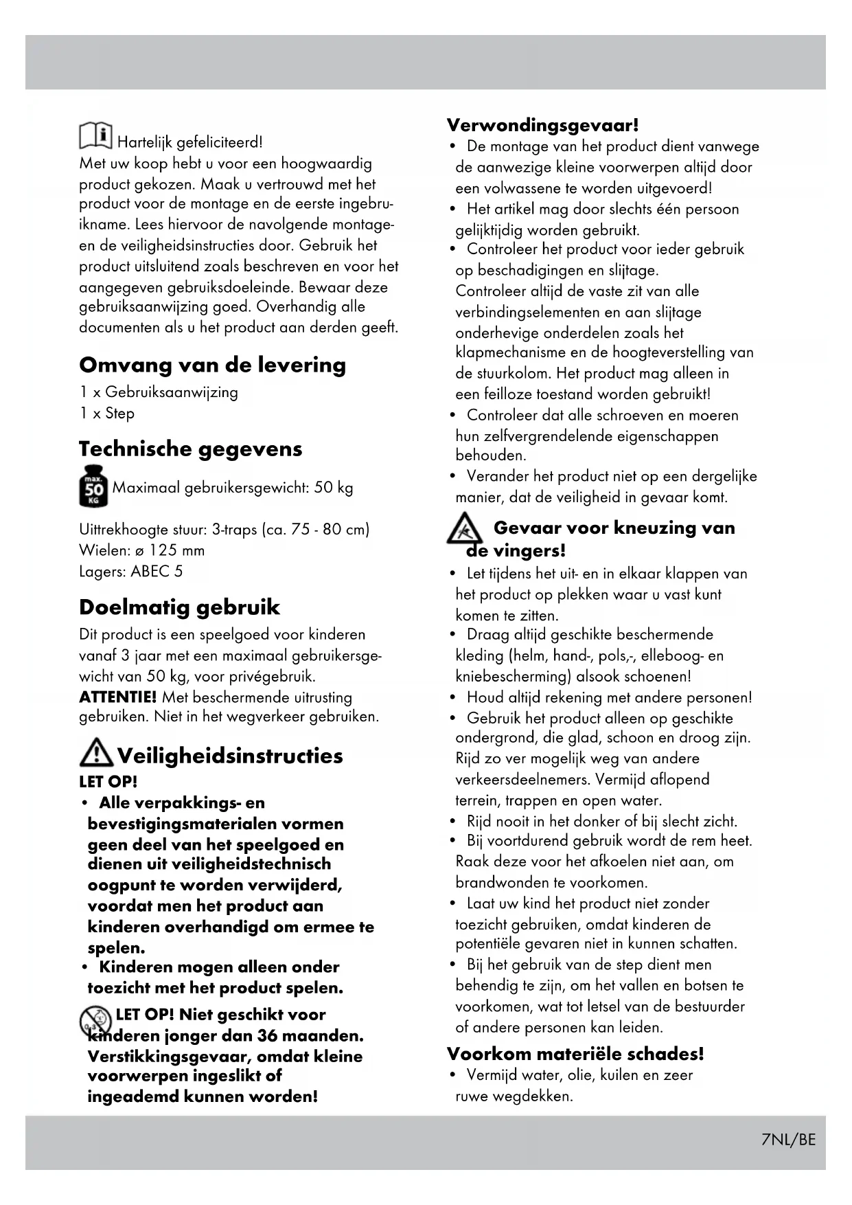 - Resserrez les roues. Soin, stockage Après utilisation de l’article, nous recomman- dons un nettoyage et un séchage complet. Retirez les gravillons ou autres objets qui seraient éventuellement restés sur les roues. Séchez les roulements mouillés avec un chiffon propre. Graissez l’extérieur des roulements avec une graisse à roulements appropriée pour prévenir la formation de rouille. Rangez l’article dans un endroit sec.7NL/BE Hartelijk gefeliciteerd! Met uw koop hebt u voor een hoogwaardig product gekozen. Maak u vertrouwd met het product voor de montage en de eerste ingebru- ikname. Lees hiervoor de navolgende montage- en de veiligheidsinstructies door. Gebruik het product uitsluitend zoals beschreven en voor het aangegeven gebruiksdoeleinde. Bewaar deze gebruiksaanwijzing goed. Overhandig alle documenten als u het product aan derden geeft. Omvang van de levering 1 x Gebruiksaanwijzing 1 x Step Technische gegevens Maximaal gebruikersgewicht: 50 kg Uittrekhoogte stuur: 3-traps (ca. 75 - 80 cm) Wielen: ø 125 mm Lagers: ABEC 5 Doelmatig gebruik Dit product is een speelgoed voor kinderen vanaf 3 jaar met een maximaal gebruikersge- wicht van 50 kg, voor privégebruik. ATTENTIE! Met beschermende uitrusting gebruiken. Niet in het wegverkeer gebruiken. Veiligheidsinstructies LET OP!