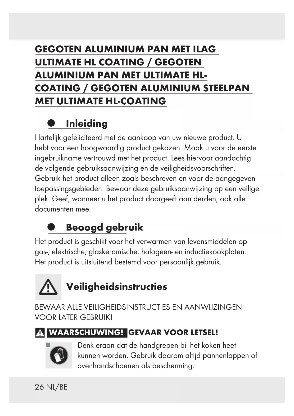Inleiding Hartelijk gefeliciteerd met de aankoop van uw nieuwe product. U hebt voor een hoogwaardig product gekozen. Maak u voor de eerste ingebruikname vertrouwd met het product. Lees hiervoor aandachtig de volgende gebruiksaanwijzing en de veiligheidsvoorschriften. Gebruik het product alleen zoals beschreven en voor de aangegeven toepassingsgebieden. Bewaar deze gebruiksaanwijzing op een veilige plek. Geef, wanneer u het product doorgeeft aan derden, ook alle documenten mee. Beoogd gebruik Het product is geschikt voor het verwarmen van levensmiddelen op gas-, elektrische, glaskeramische, halogeen- en inductiekookplaten. Het product is uitsluitend bestemd voor persoonlijk gebruik. Veiligheidsinstructies